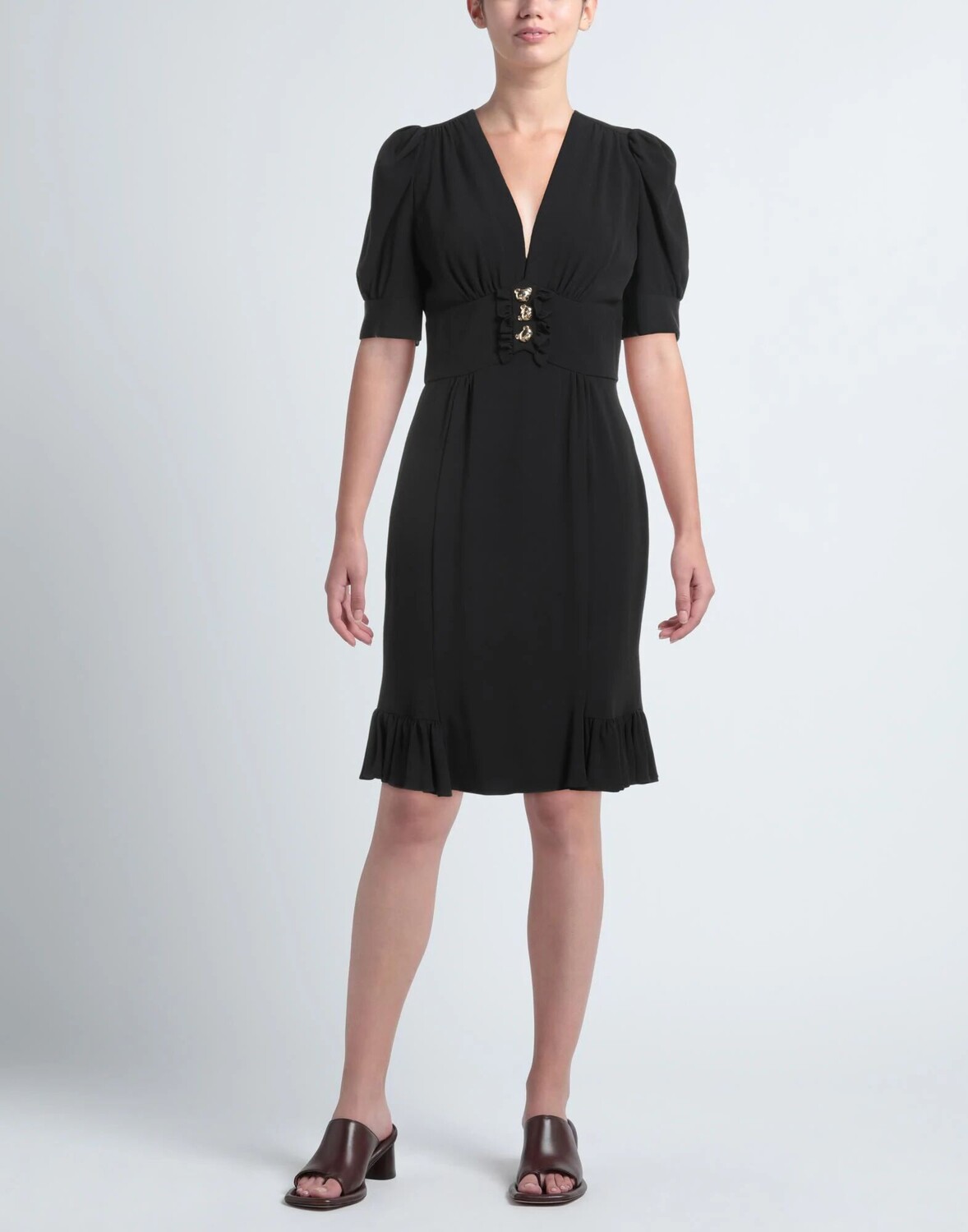 Креп, оборки, металлические аппликации, одноцветное изделие, глубокий вырез, короткие рукава, внутри на подкладке, застежка-молния, без карманов, фасон-карандаш