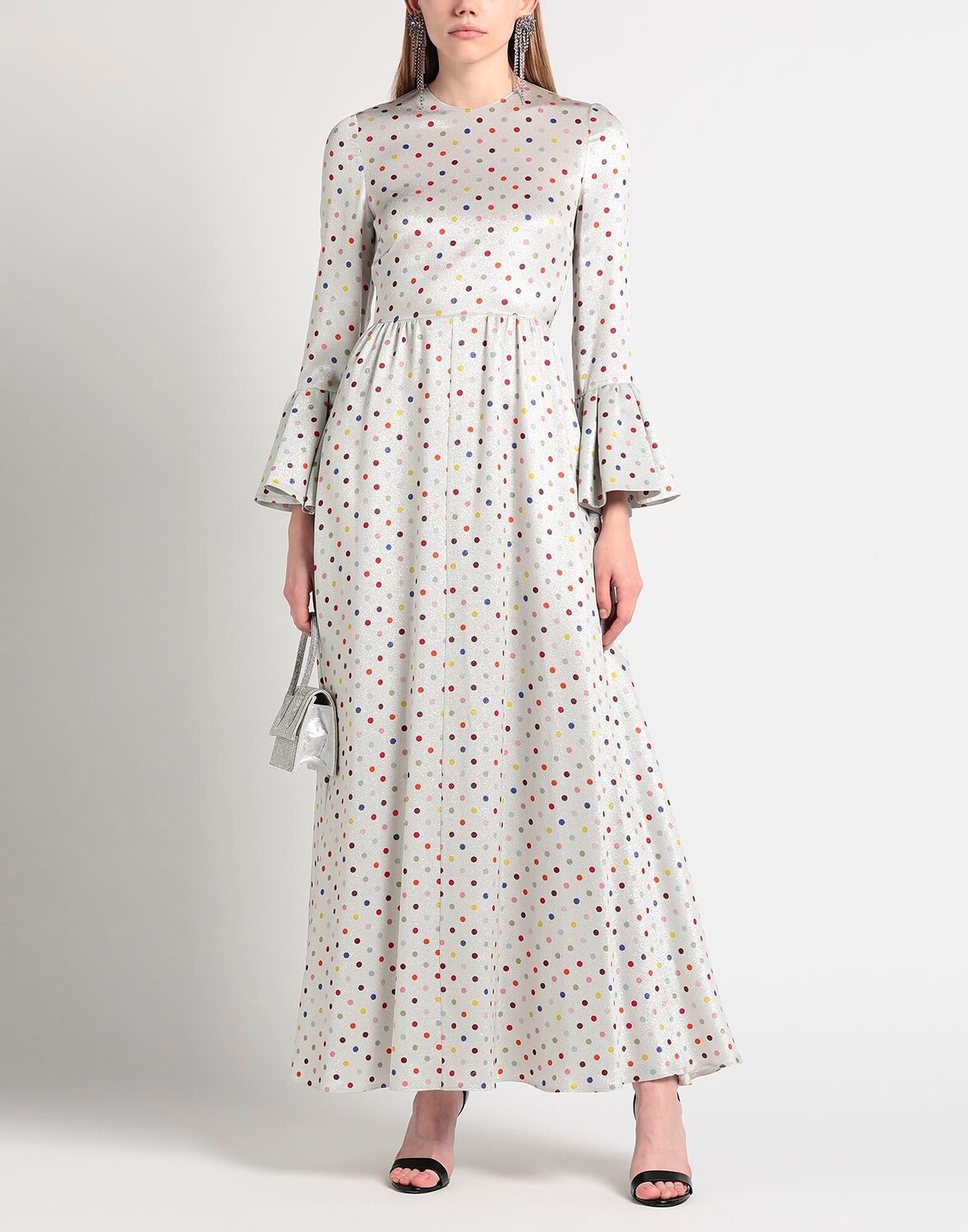 Креп, эффект ламинирования, без аппликаций, в горошек, круглый воротник, длинные рукава, без карманов, застежка сзади, на крючках, молния, без подкладки, фасон трапеция