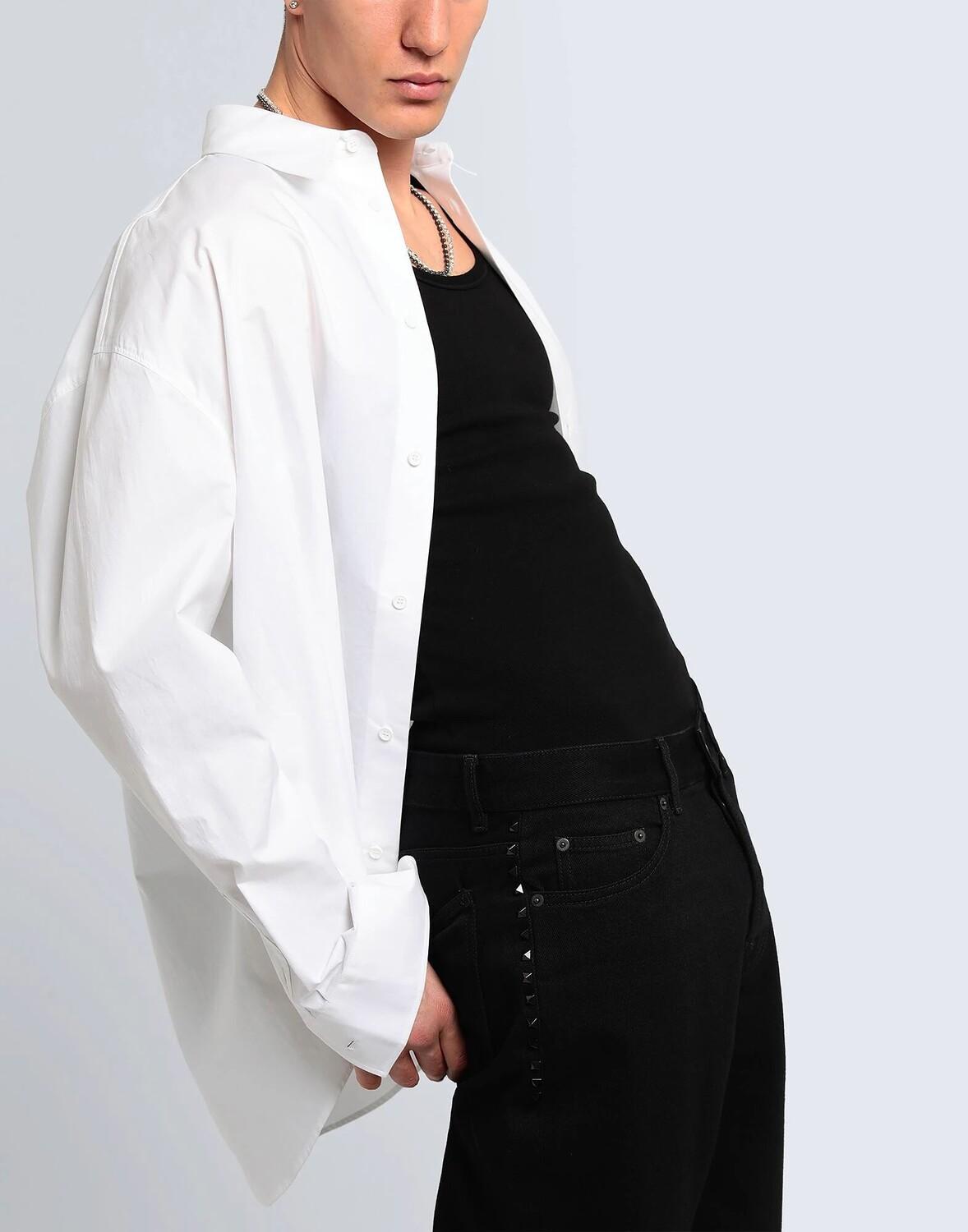 Джинсовая ткань, логотип бренда, заклепки, одноцветное изделие, цветная расцветка, завышенная талия, прямые брючины, классический крой, потайные пуговицы, 1 пуговица, пять карманов, модель прямого кроя