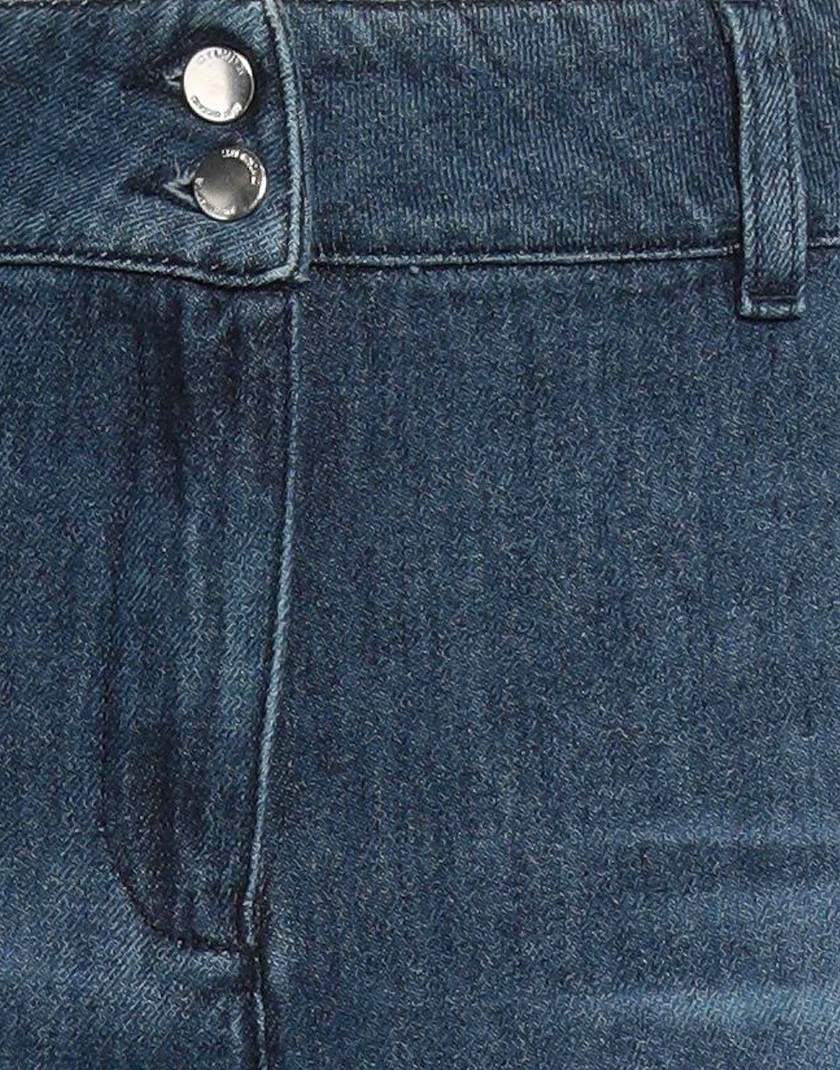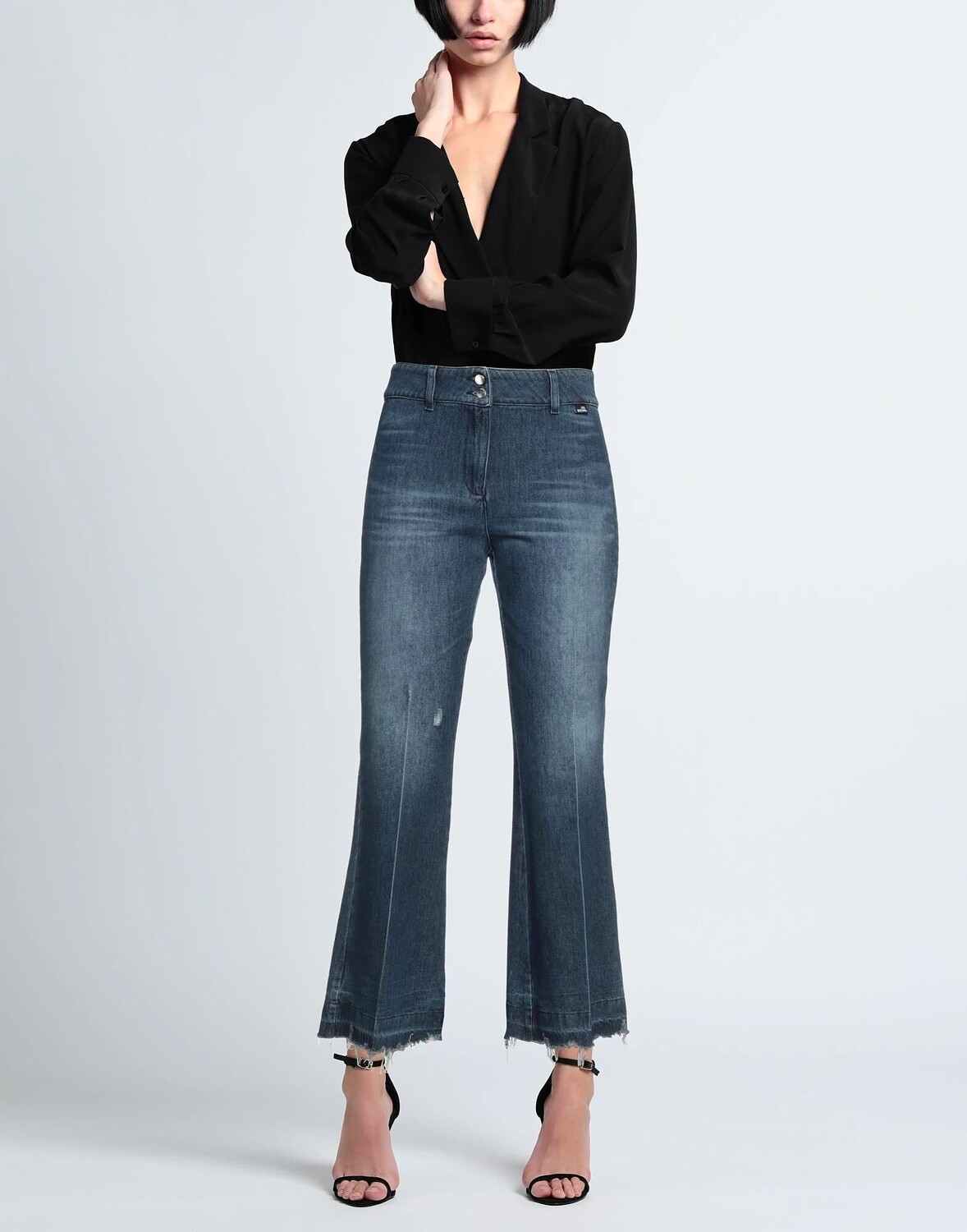Джинсовая ткань, потертости, логотип бренда, одноцветное изделие, темная стирка, завышенная талия, расклешенный крой, классический крой, кнопки, без карманов, расклешенный и широкий крой