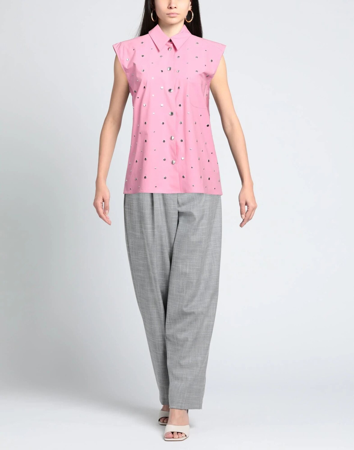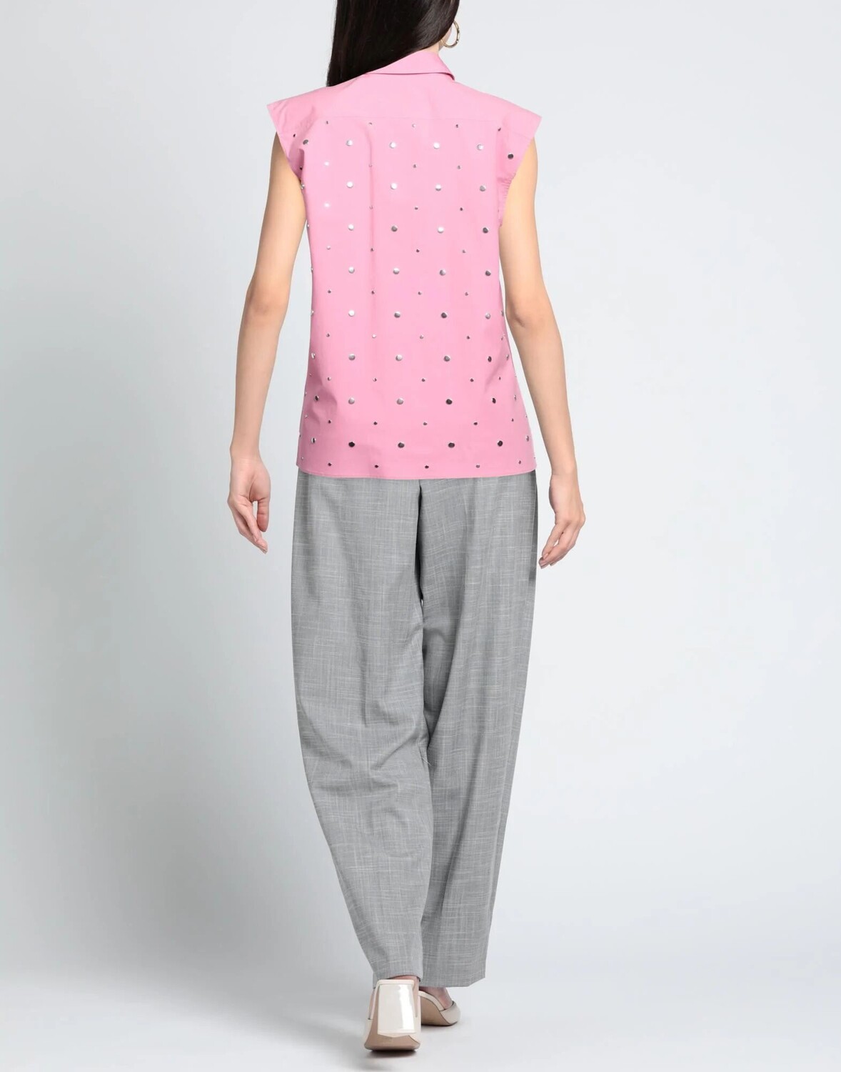 Тканый материал, логотип бренда, металлические аппликации, горошек, классический воротник, без рукавов, кнопки, один нагрудный карман, эластичный, ручная стирка, нельзя сушить в стиральной машине, не отбеливать, рубашка