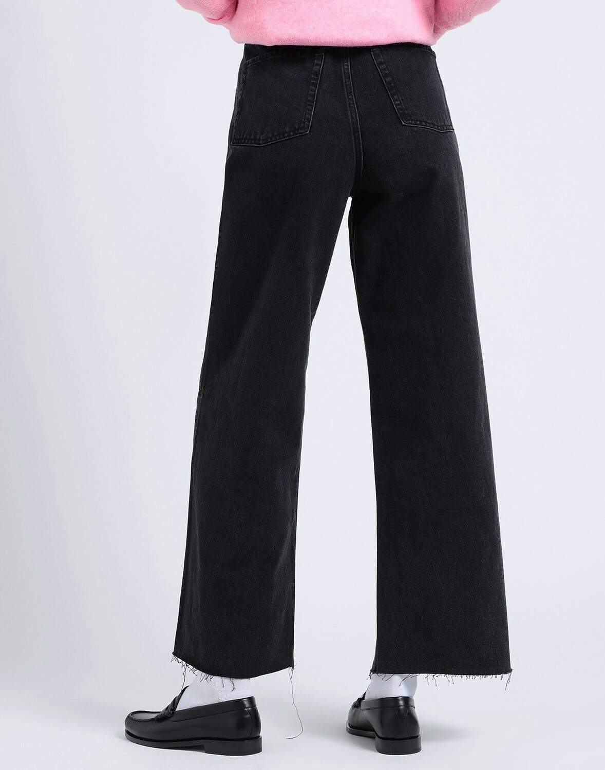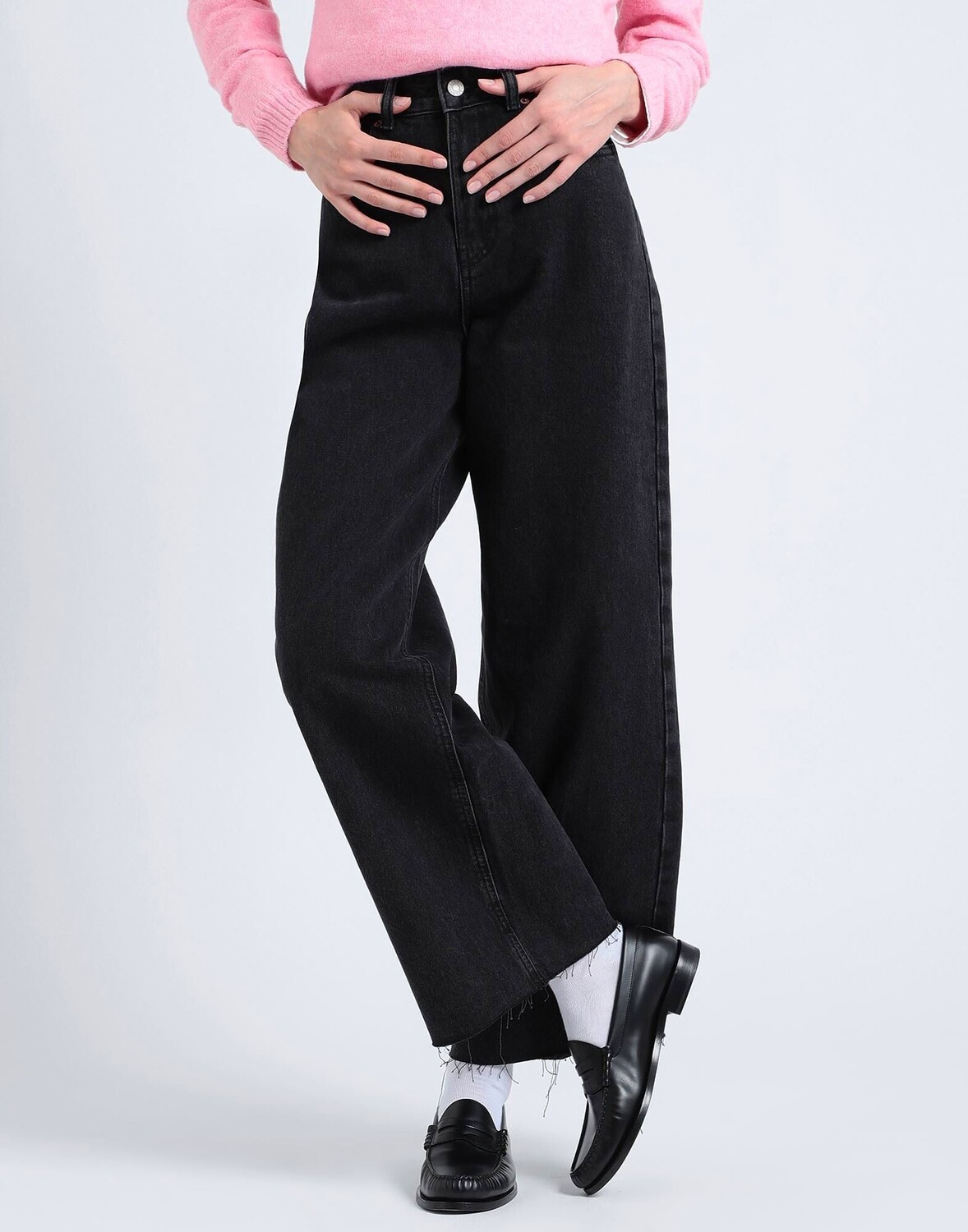 Деним, потертости, логотип бренда, одноцветное изделие, цветная стирка, завышенная талия, прямые брючины, 1 пуговица, застежка-молния, необработанный низ, пять карманов, модель прямого кроя