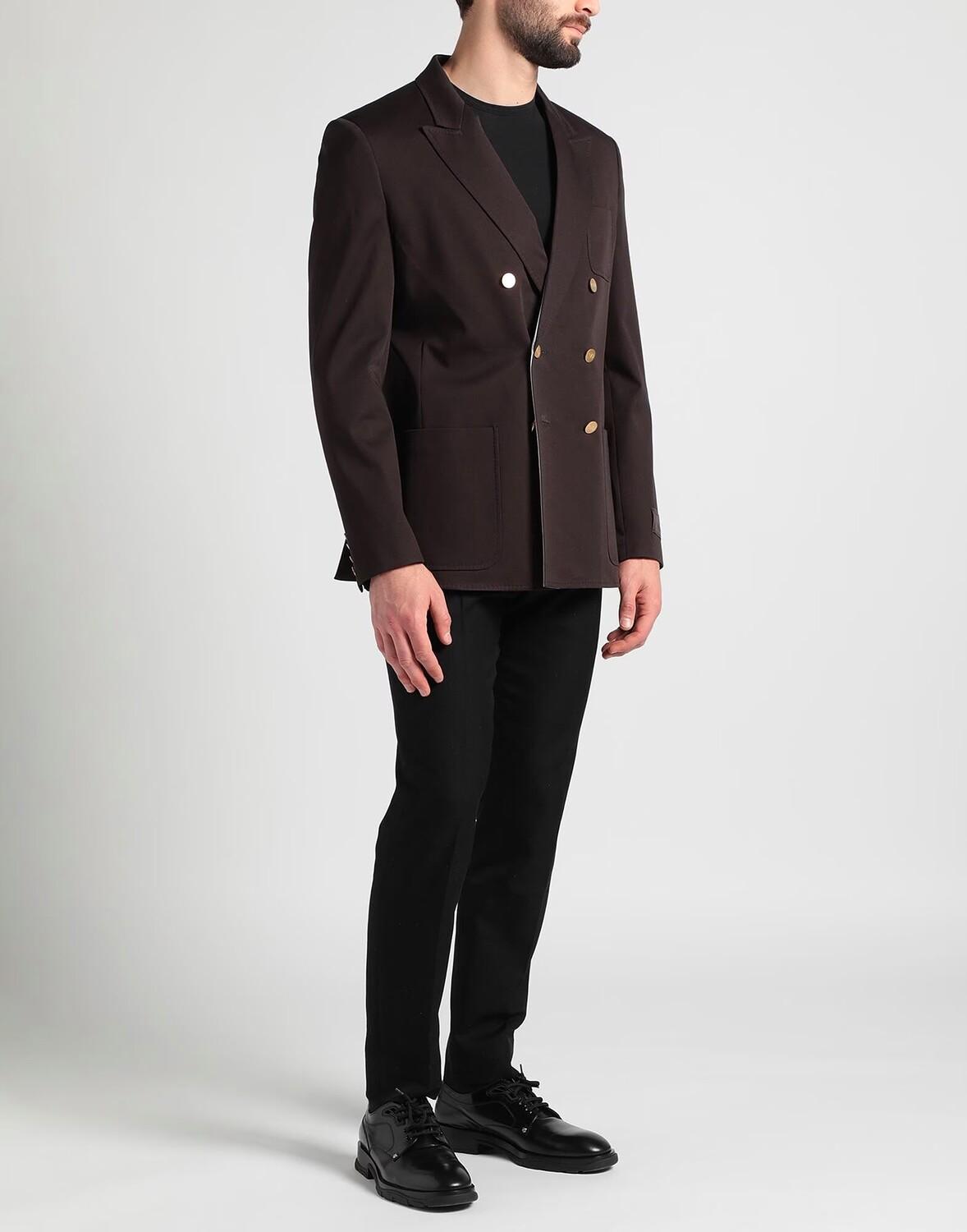 Ткань, логотип бренда, одноцветное изделие, воротник с лацканами, длинные рукава, манжеты на пуговицах, внутри на подкладке, застежка на пуговицы, множество карманов, стрейч, химическая чистка, нельзя отбеливать, нельзя сушить в стиральной машине, двубортный пиджак
