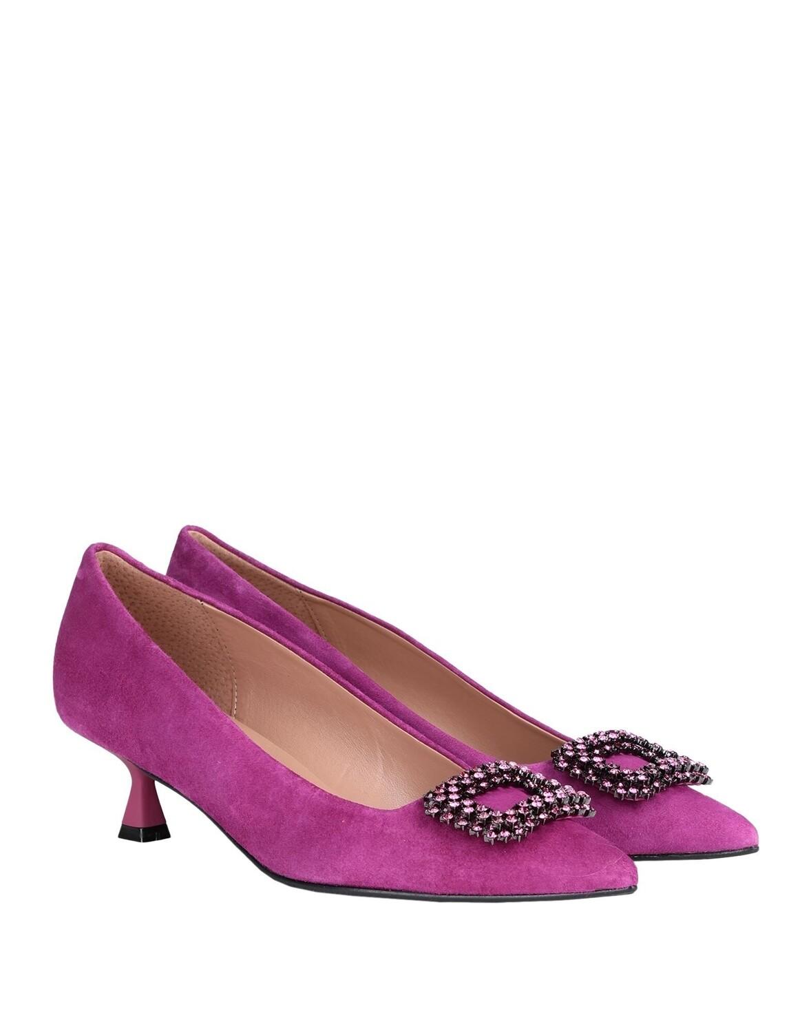 Эффект замши, стразы, одноцветное изделие, кожаная подкладка, узкий носок, каблук- катушка, резиновая подошва, содержит нетекстильные части животного происхождения, туфли-лодочки