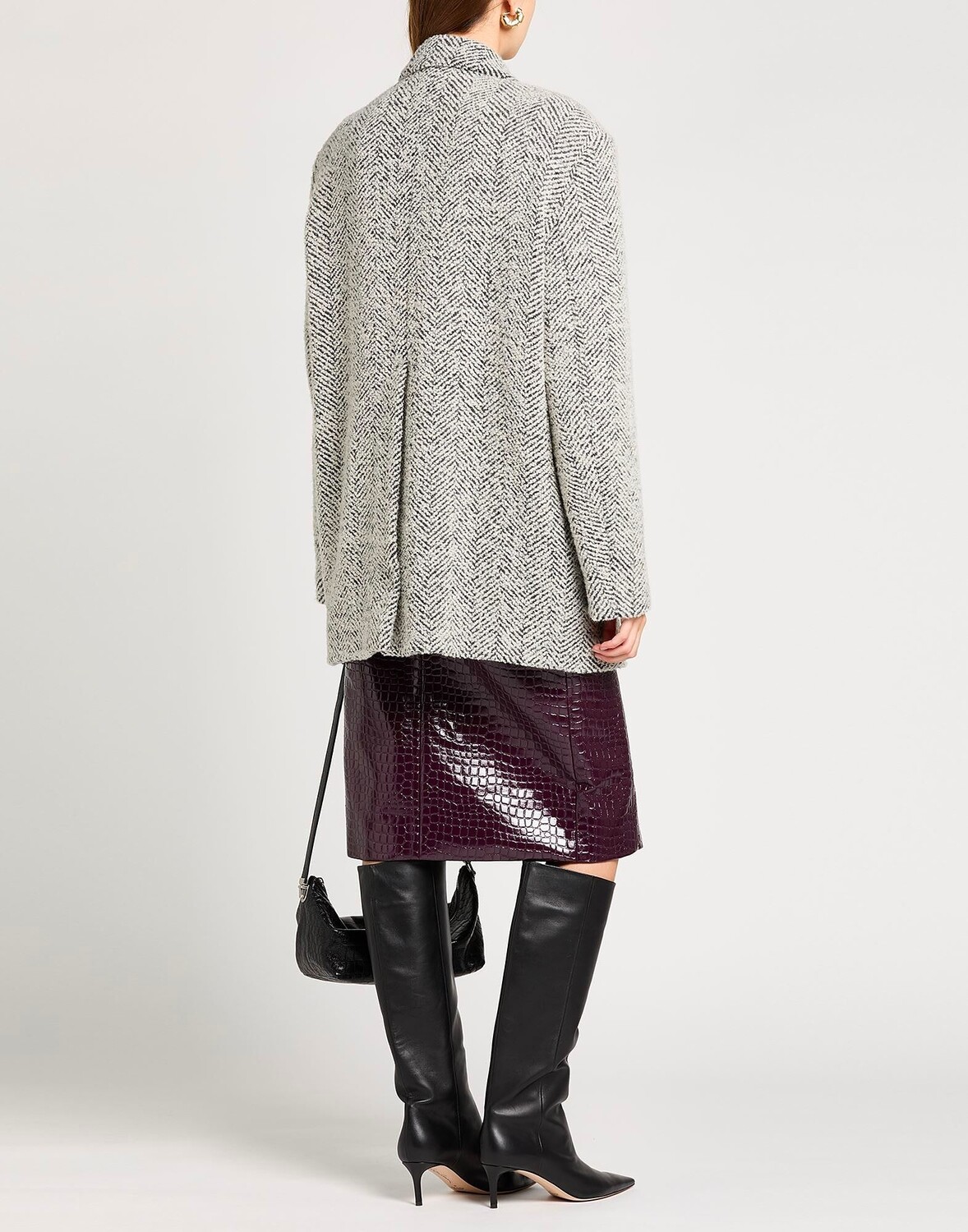 Букле, без аппликаций, узор «елочка», воротник с лацканами, длинные рукава, полностью на подкладке, застежка на пуговицы, множество карманов, химчистка, не отбеливать, нельзя сушить в стиральной машине, пальто однобортное