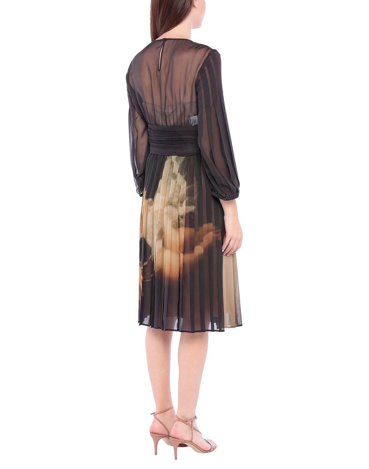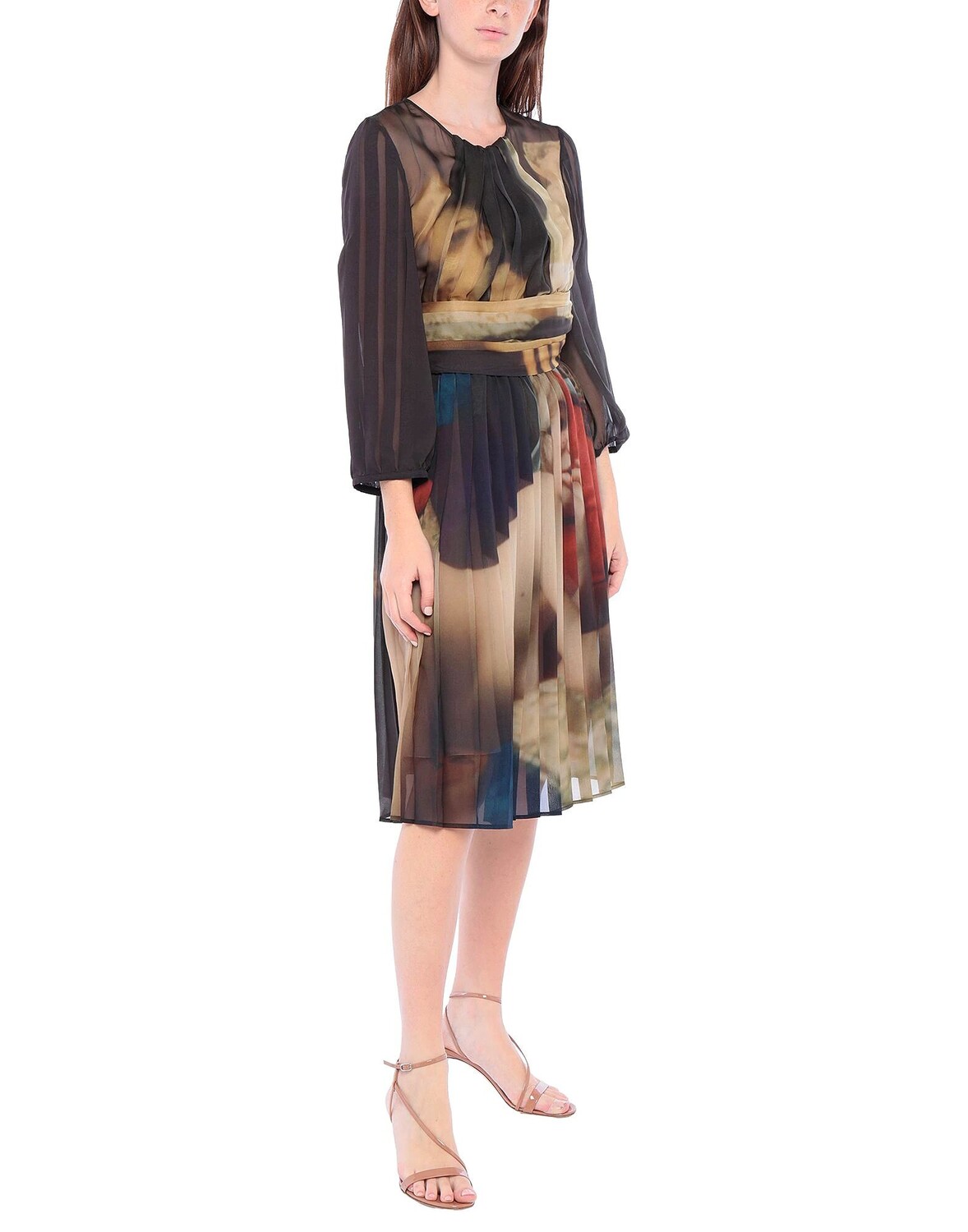 Креп, драпированная отделка, разноцветный узор, круглый воротник, длинные рукава, без карманов, манжеты на пуговицах, застежка сзади, пуговицы, скользит по линии