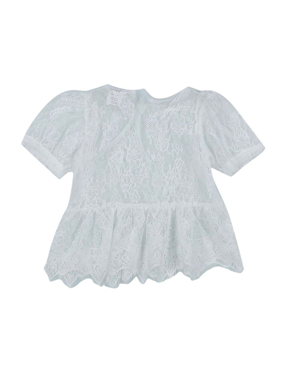 Кружево, без аппликаций, одноцветное изделие, круглый вырез, короткие рукава, рукава-буфы, без подкладки, ручная стирка, химическая чистка, нельзя отбеливать, нельзя сушить в стиральной машине, гладить при температуре не выше 110°C