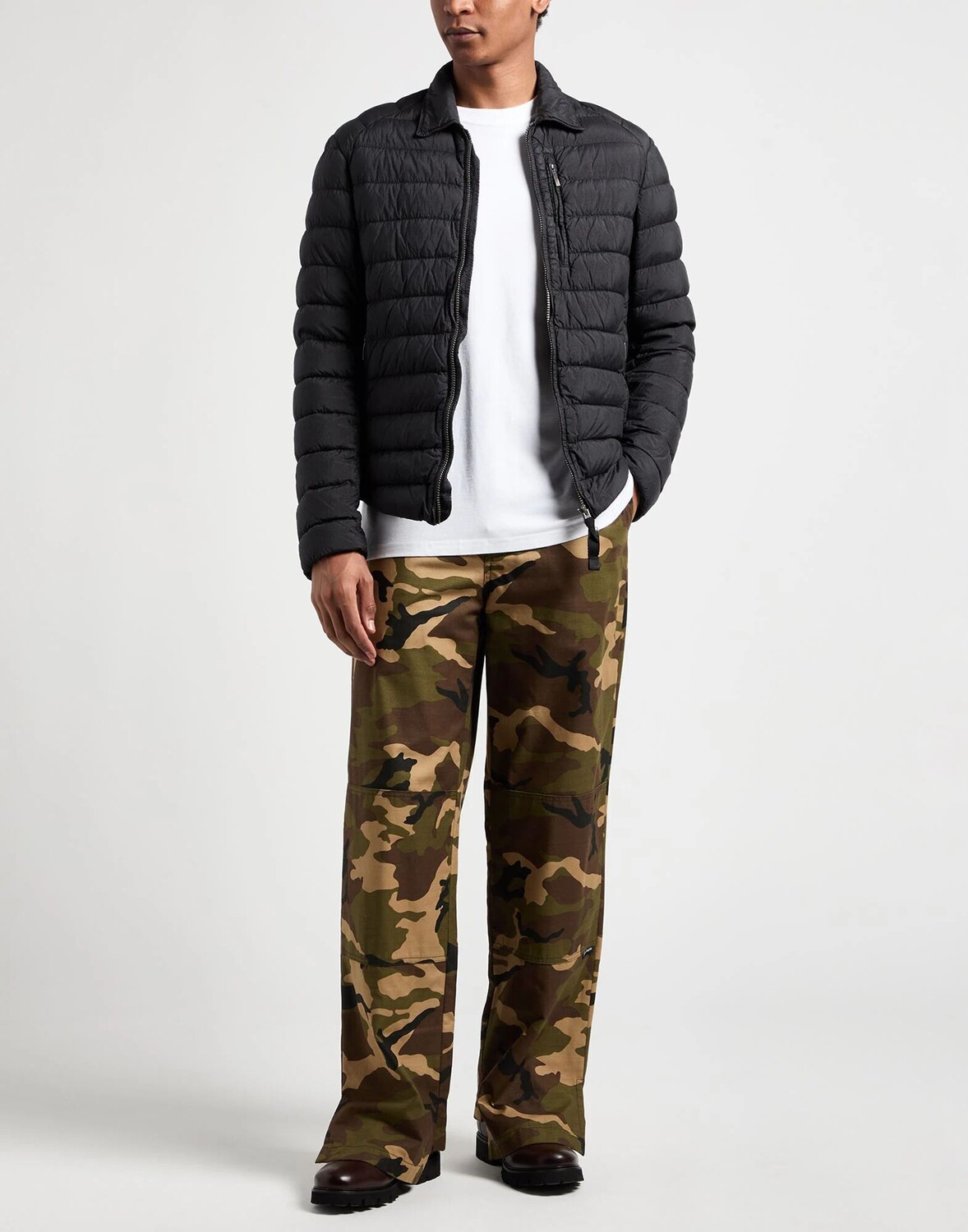 Ткань, стеганая ткань, логотип бренда, одноцветное изделие, классический воротник, однобортный, длинные рукава, наполнитель из утиного пуха, застежка-молния, карманы на молнии, содержит нетекстильные части животного происхождения, машинная стирка, не отбеливать, нельзя сушить в стиральной машине , не гладить, пуховик