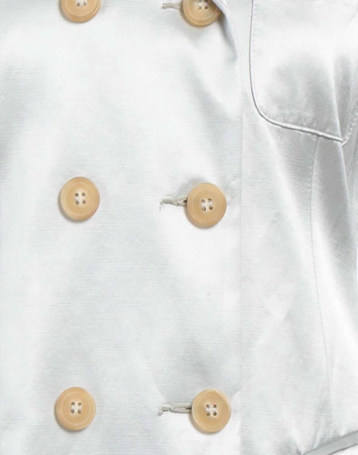 Атлас, без аппликаций, одноцветное изделие, воротник с лацканами, двубортный, длинные рукава, на подкладке, застежка на пуговицы, множество карманов, двубортный пиджак