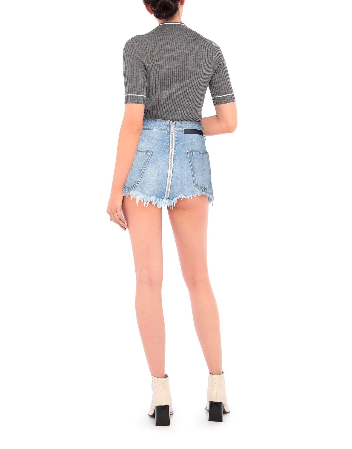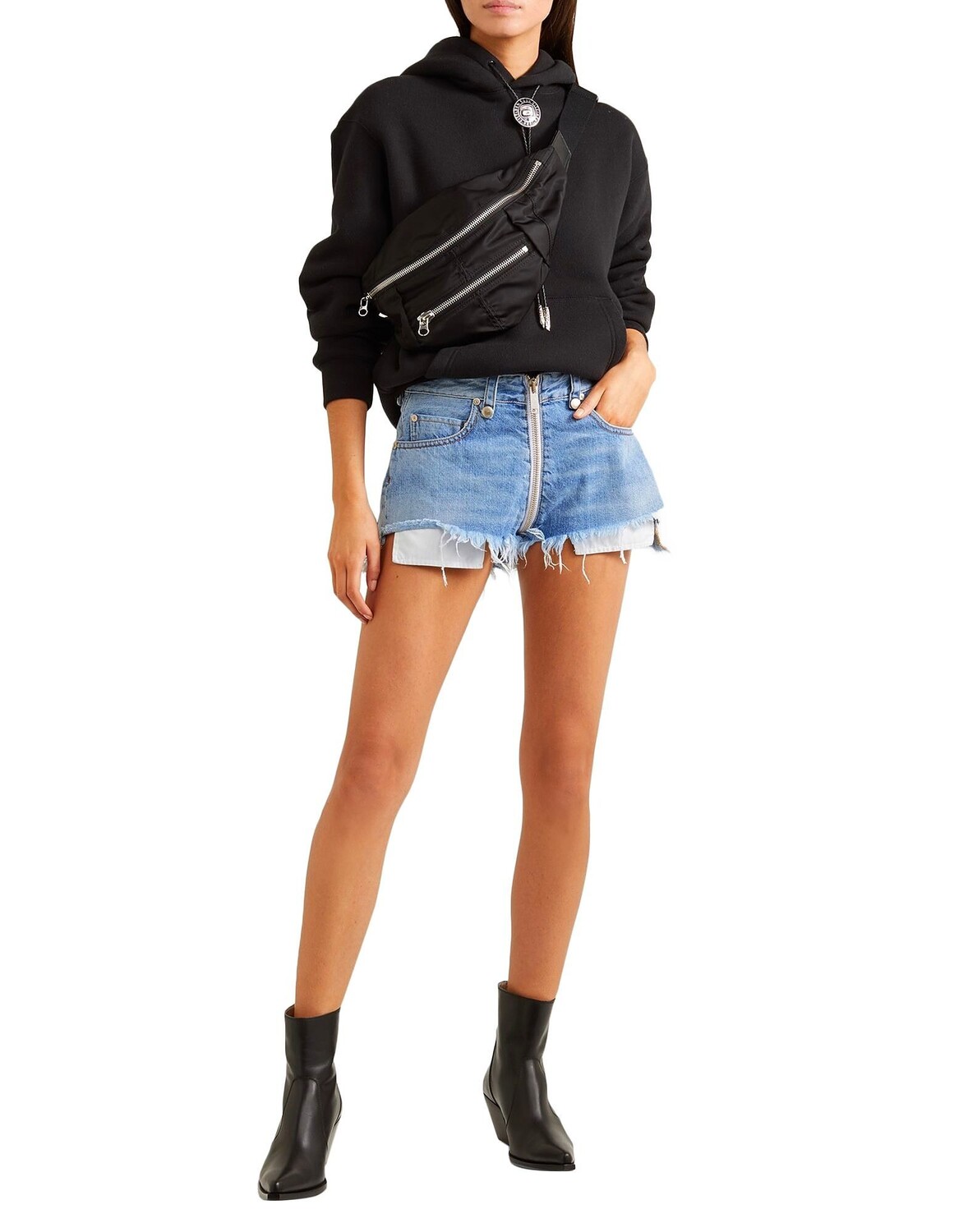 Джинсовая ткань, логотип бренда, одноцветное изделие, средняя степень стирки, застежка-молния, бахрома по низу, множество карманов, шорты