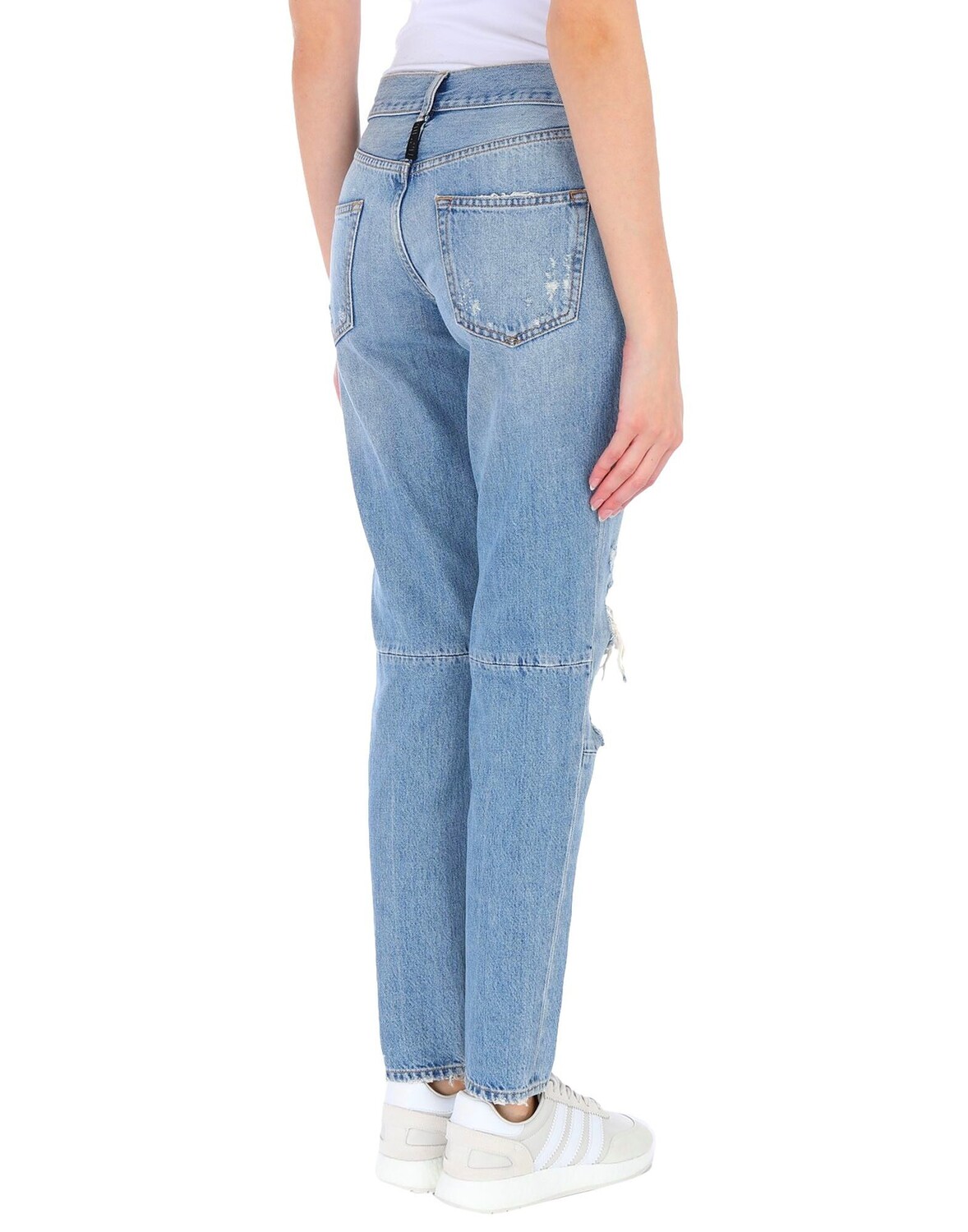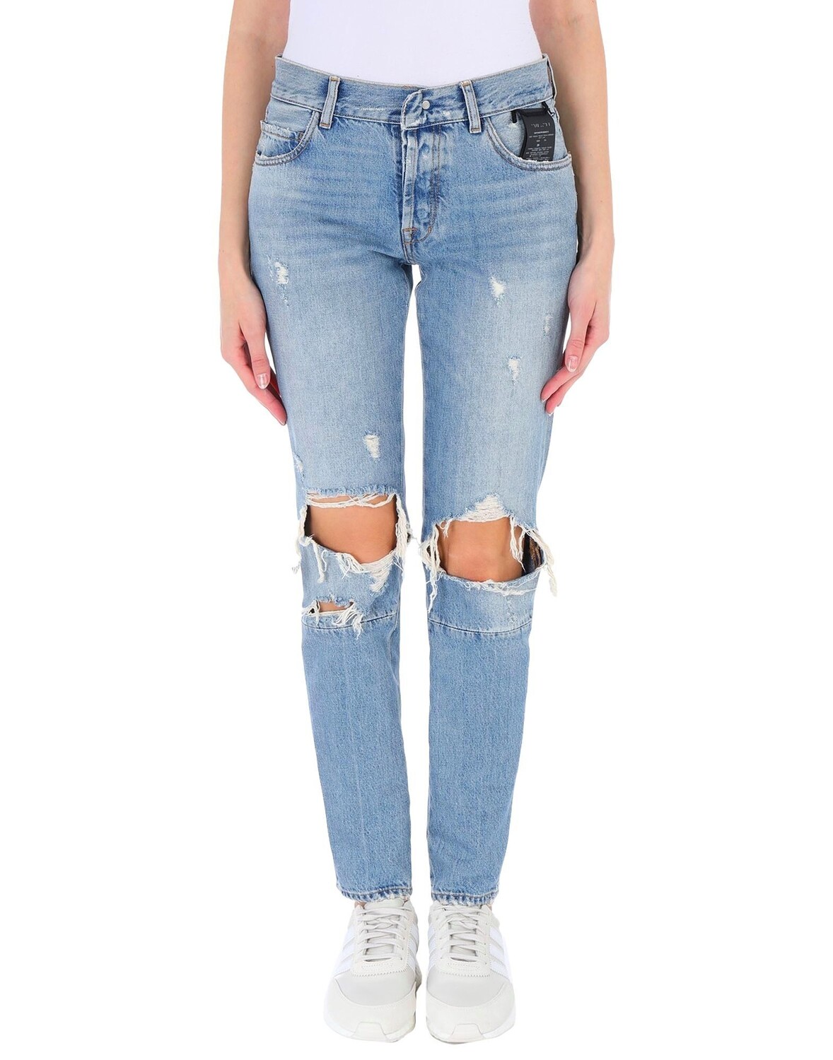 Деним, рваная ткань, выцветший, логотип, одноцветное изделие, средняя стирка, средняя посадка, застежка спереди, пуговицы, множество карманов