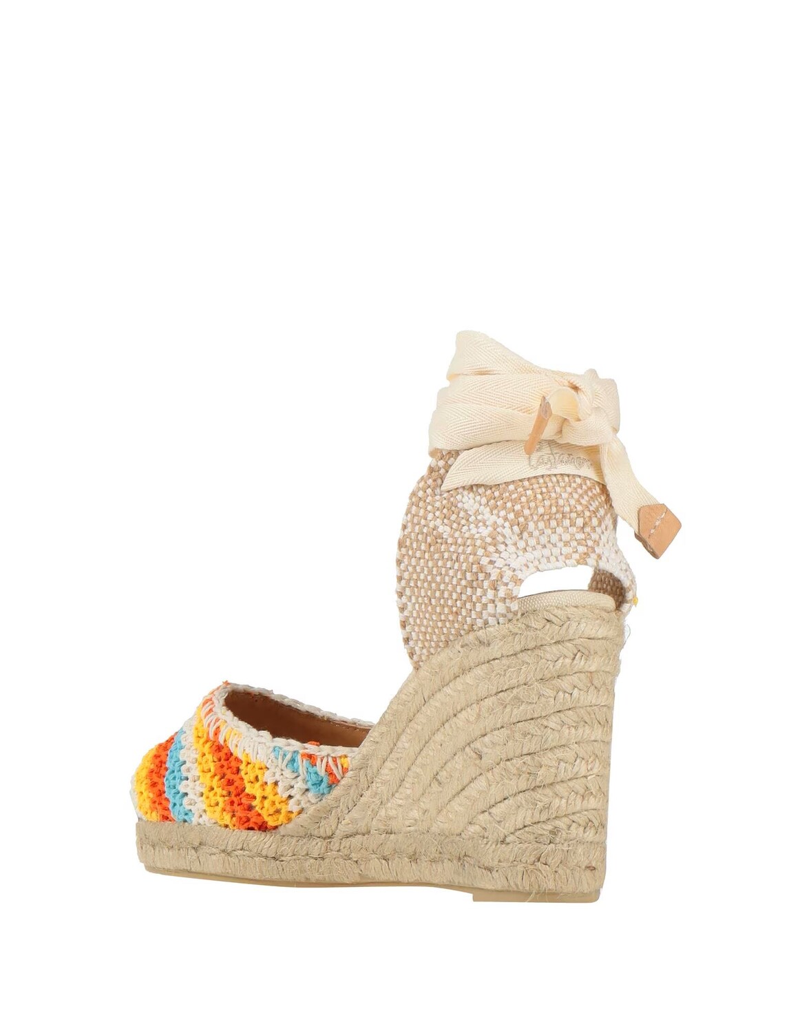 Трикотажное изделие, ажурный узор, вышивка, логотип бренда, в полоску, внутри на подкладке, скругленный носок, танкетка, веревочная танкетка, резиновая подошва, открытые эспадрильи