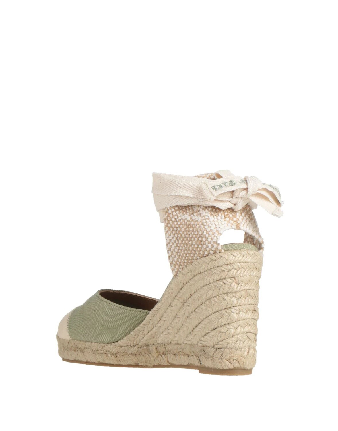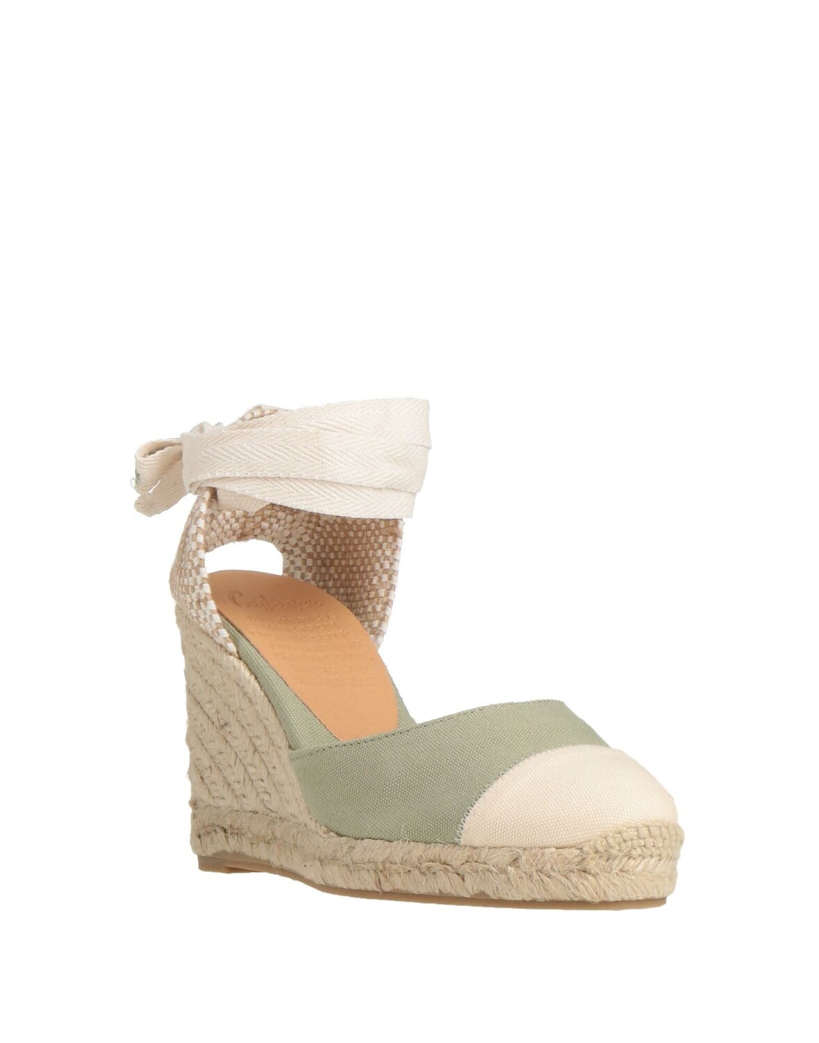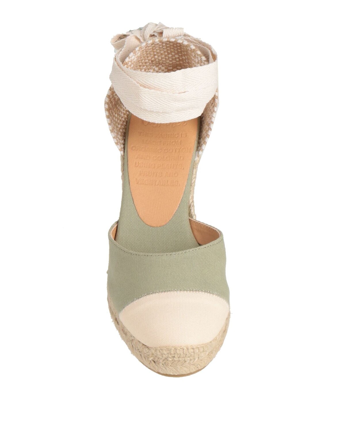 Парусина, без аппликаций, двухцветное изображение, подкладка из кожи, скругленный носок, танкетка, веревочный каблук, резиновая подошва, содержит нетекстильные части животного происхождения, открытые эспадрильи