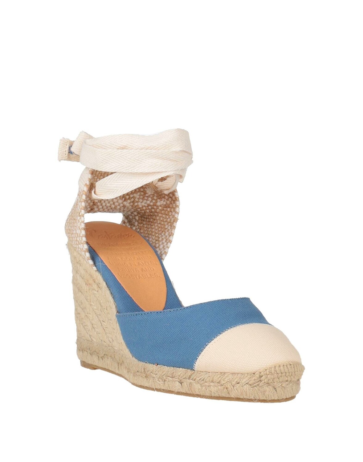Парусина, без аппликаций, двухцветное изображение, подкладка из кожи, скругленный носок, танкетка, веревочный каблук, резиновая подошва, содержит нетекстильные части животного происхождения, открытые эспадрильи