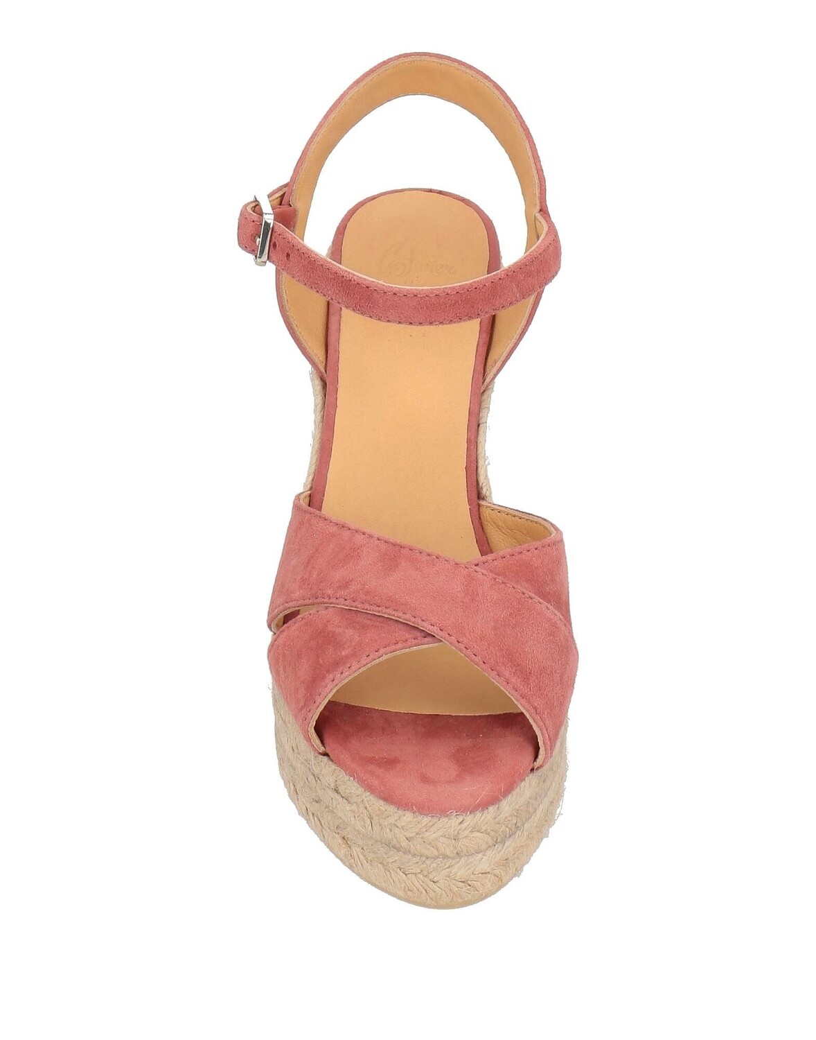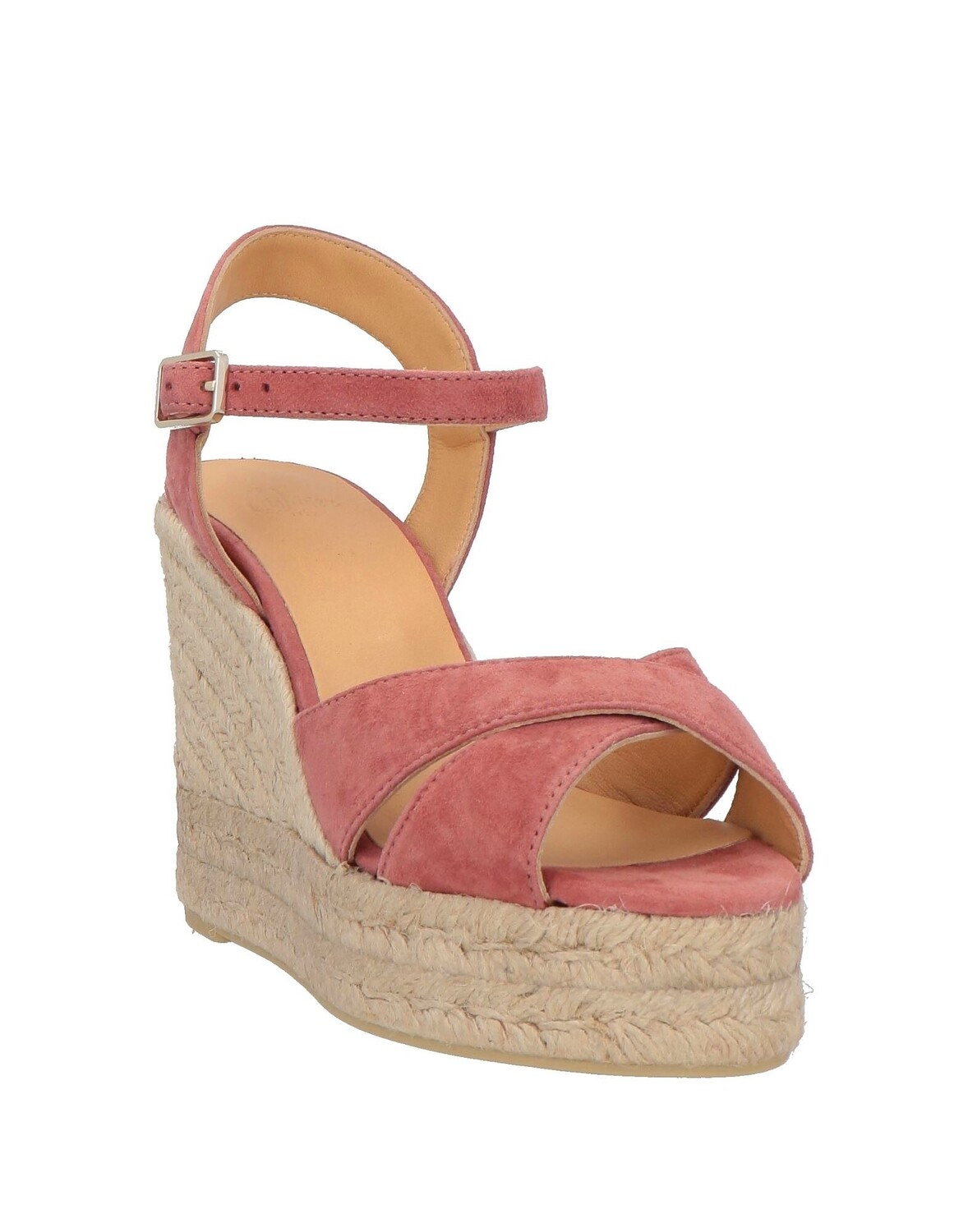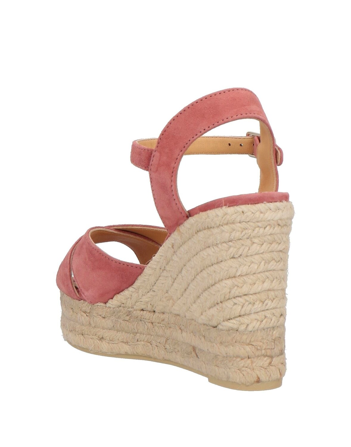 Кожа, эффект замши, без аппликаций, одноцветное изделие, кожаная подкладка, застежка-пряжка, скругленный носок, танкетка, веревочная танкетка, резиновая подошва, содержит нетекстильные части животного происхождения, сандалии-эспадрилья