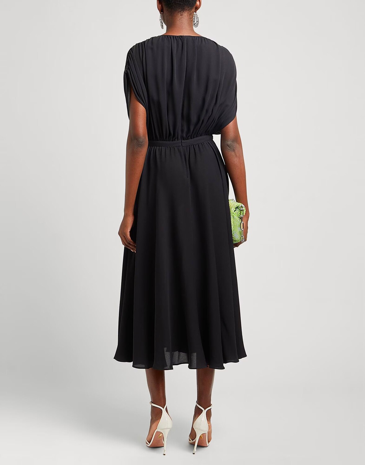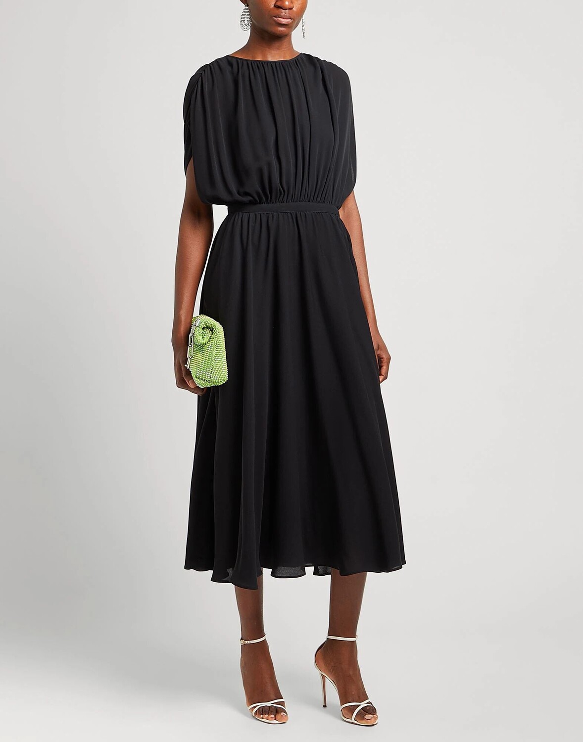 Креп, без аппликаций, одноцветное изделие, круглый вырез, короткие рукава, без подкладки, застежка-молния, без карманов, химчистка, нельзя отбеливать, нельзя сушить в стиральной машине, платье-клеш