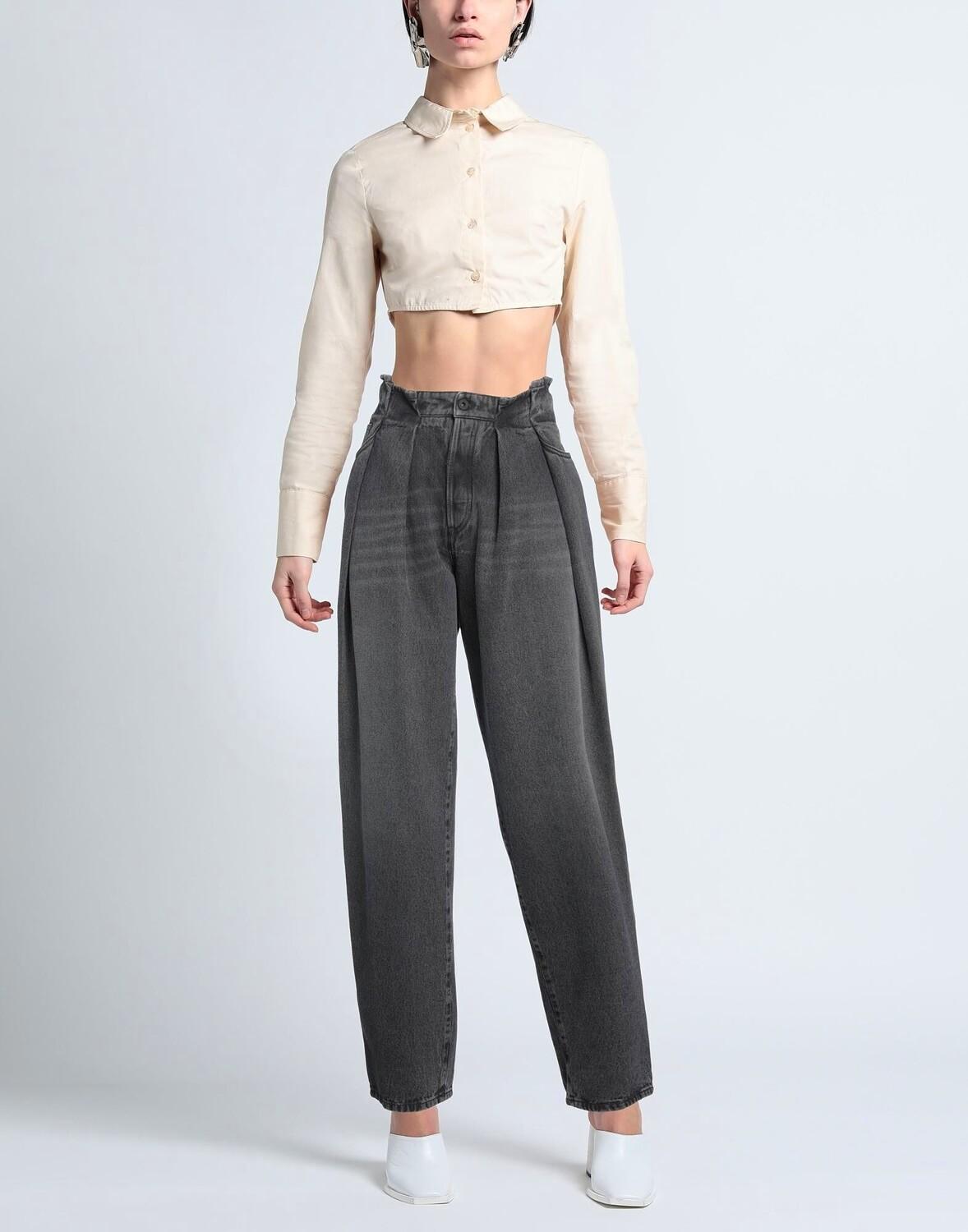 Джинсовая ткань, вытачки, одноцветное изделие, цветная расцветка, завышенная талия, широкие брючины, пуговицы, множество карманов, зауженная модель