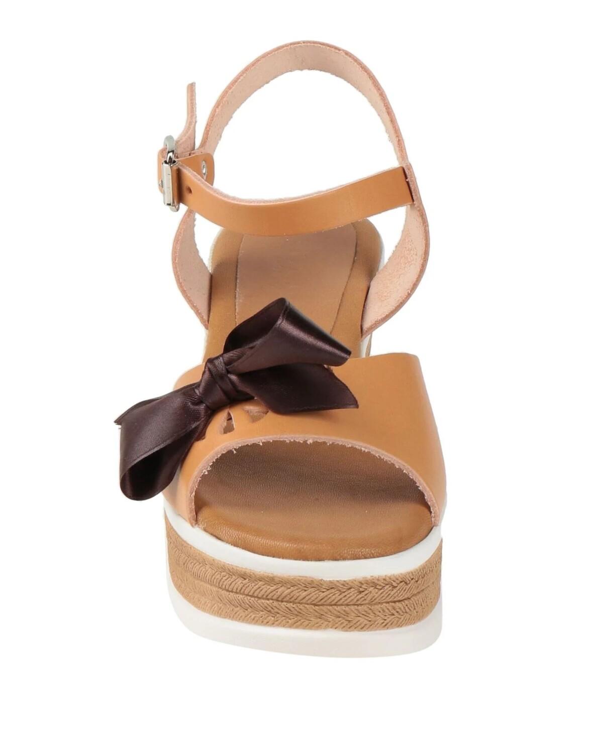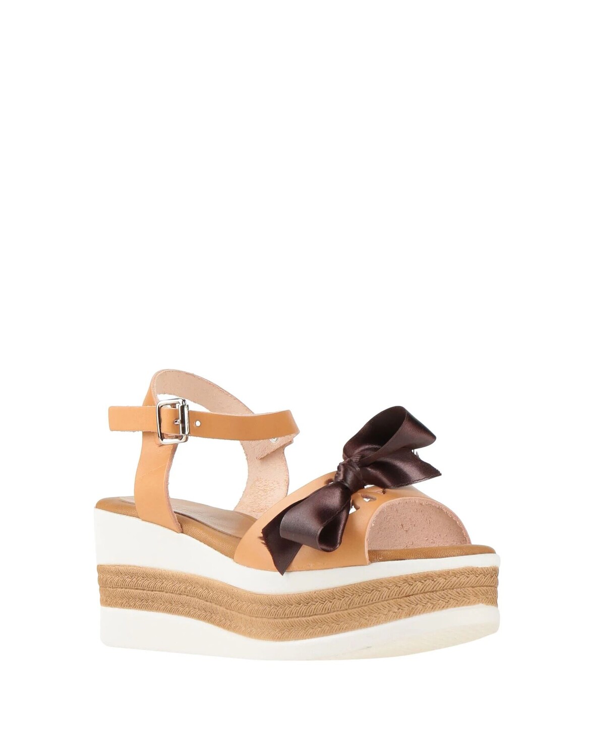 Кожа, атлас, бант, одноцветное изделие с аппликациями, кожаная подкладка, ремешок с пряжкой на щиколотке, скругленный носок, каблук-танкетка, резиновая подошва, содержит нетекстильные части животного происхождения, сандалии с ремешком на щиколотке