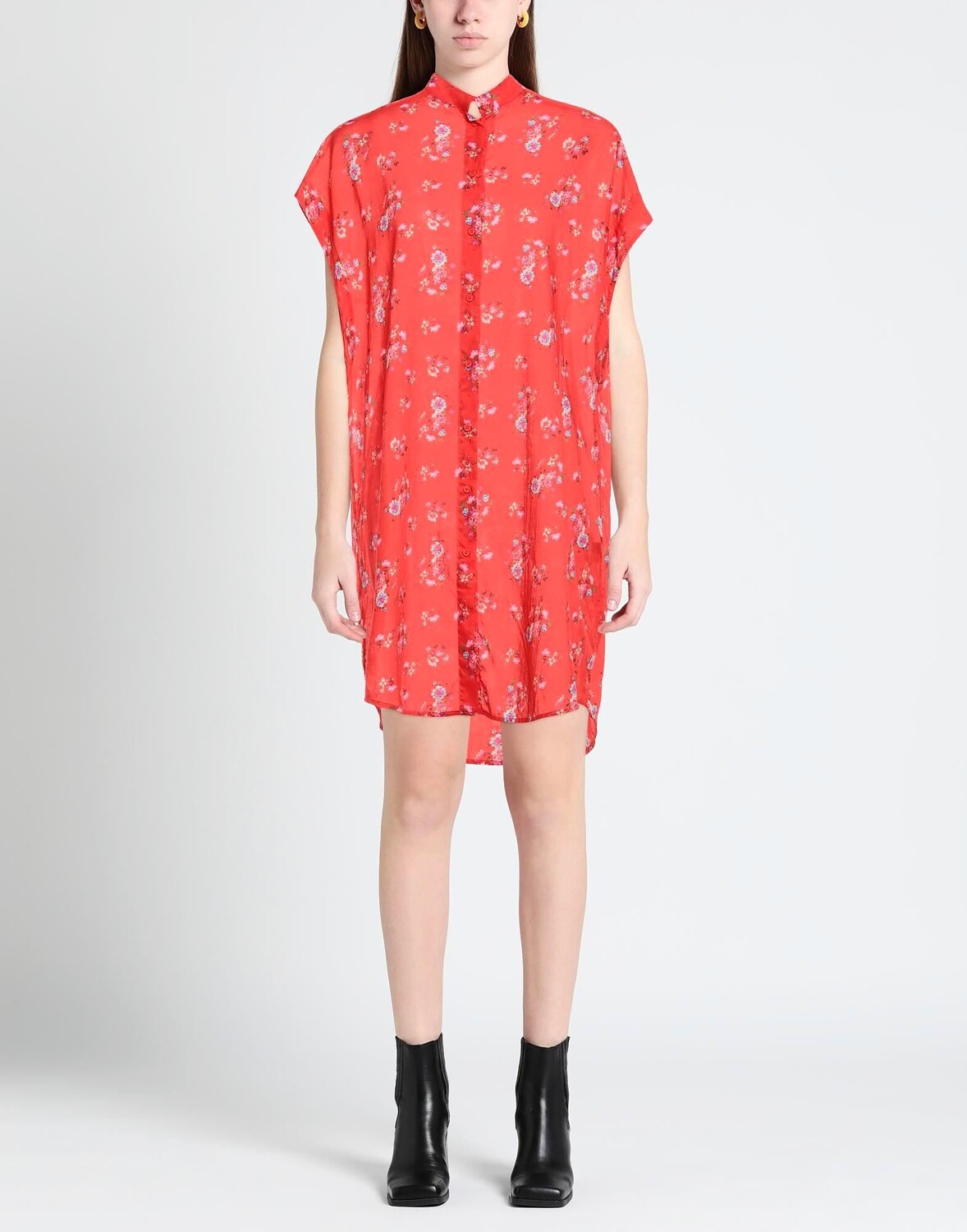 Полотняное плетение, без аппликаций, цветочный дизайн, классический вырез горловины, короткие рукава, без подкладки, пуговицы, без карманов, платье-рубашка