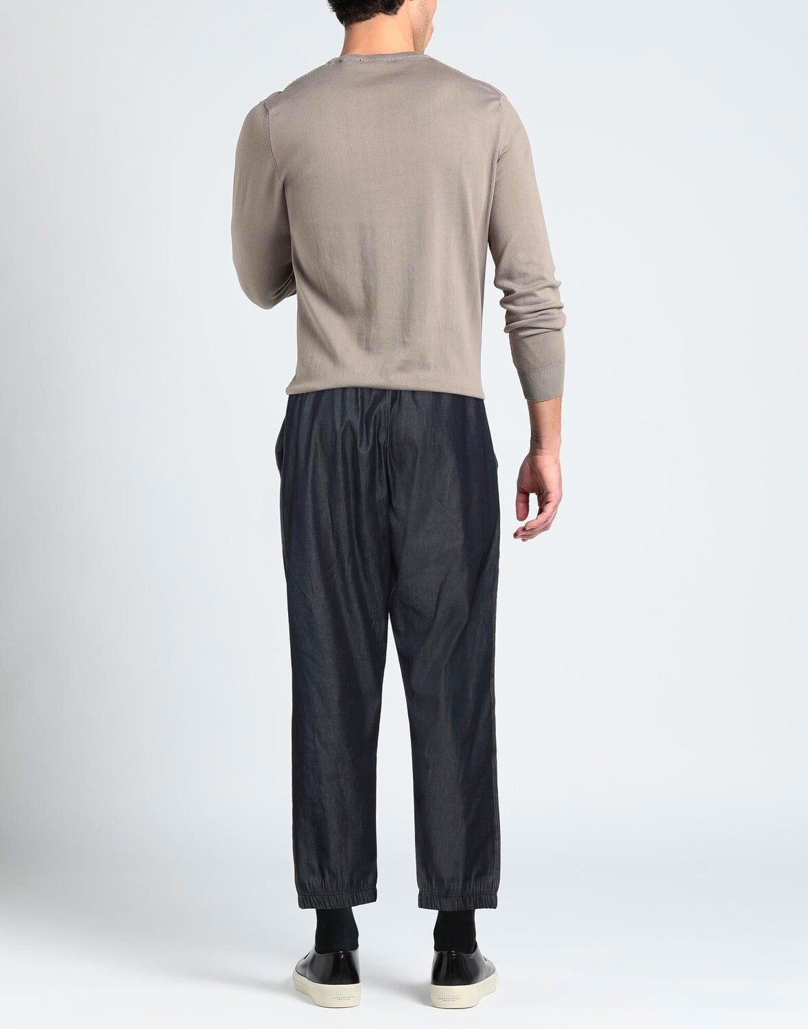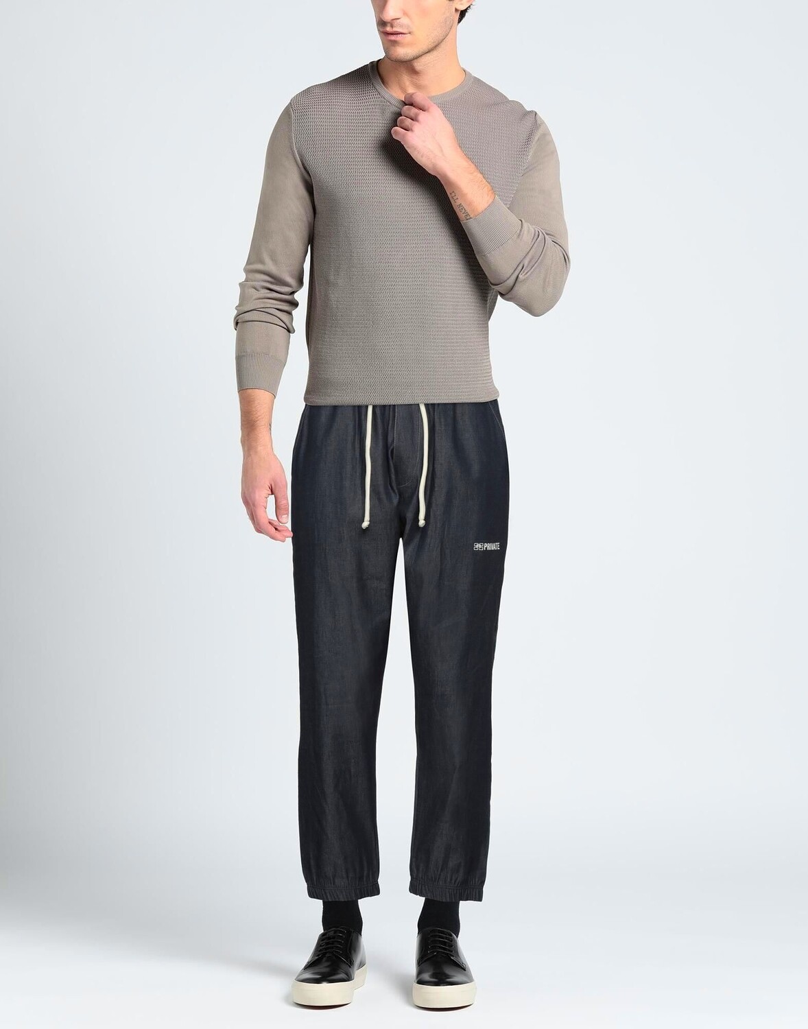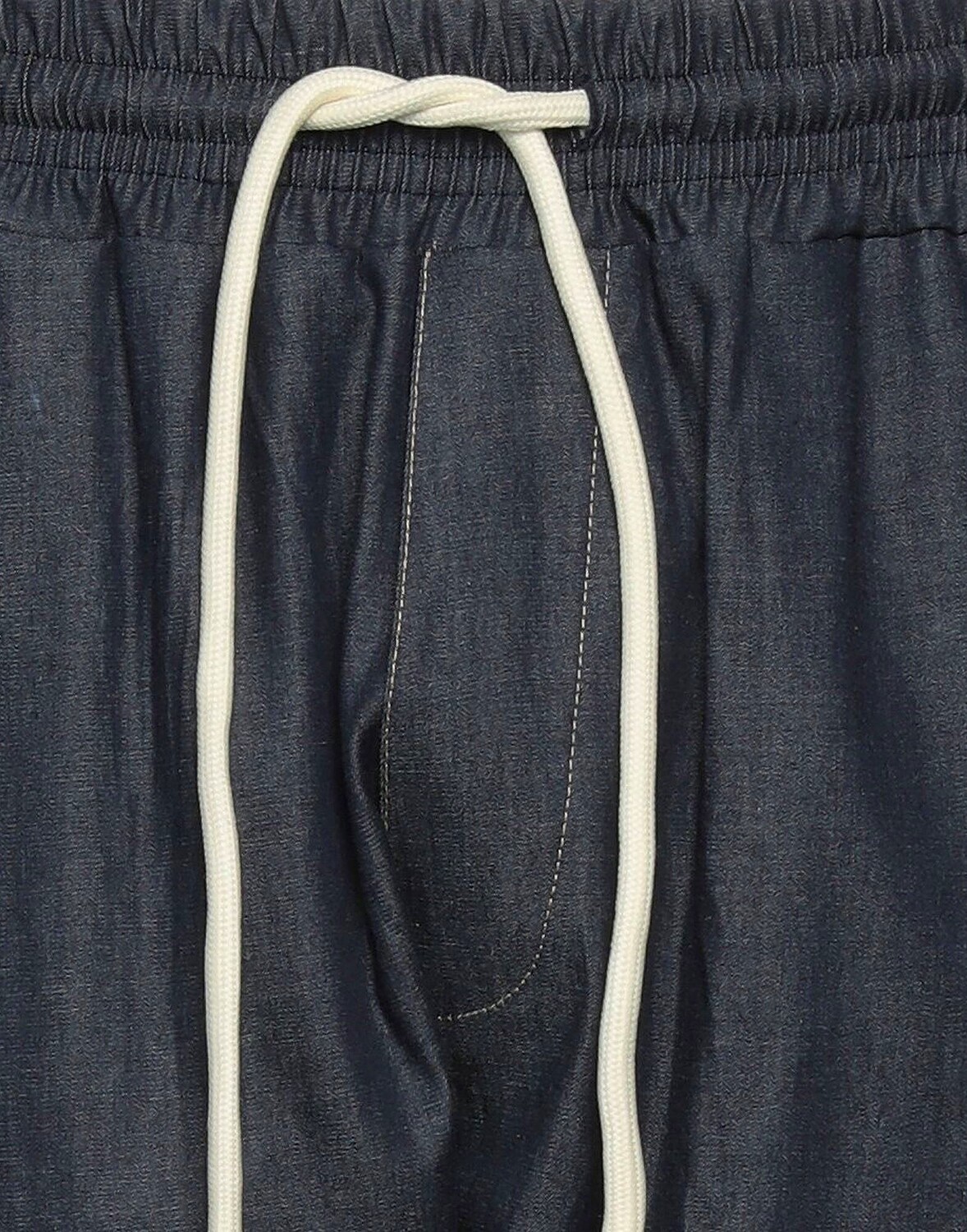 Деним, логотип бренда, одноцветное изделие, темная стирка, завышенная талия, застежка на шнурок, эластичный низ, множество карманов, модель прямого кроя