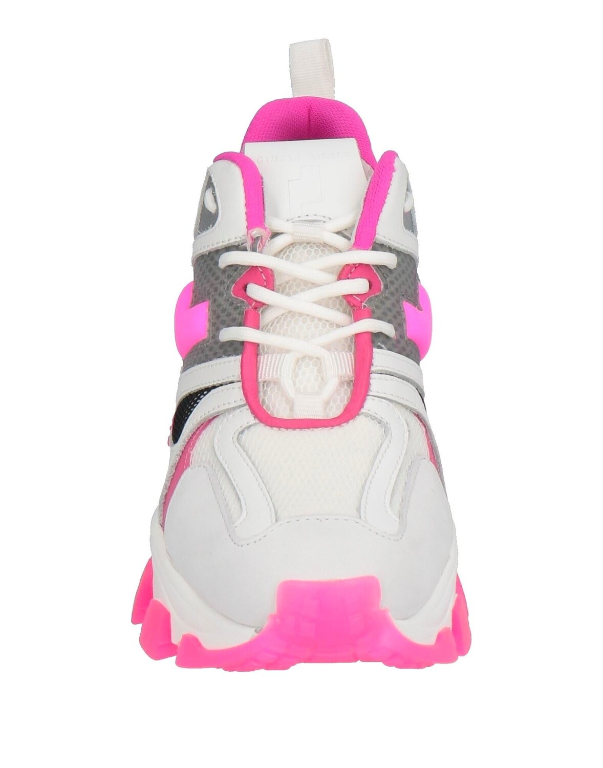 Кожа, техническая ткань, логотип бренда, разноцветный рисунок, внутренняя часть из технической ткани, шнуровка, скругленный носок, геометрический каблук, подошва с выступами, содержит нетекстильные части животного происхождения, массивные кроссовки