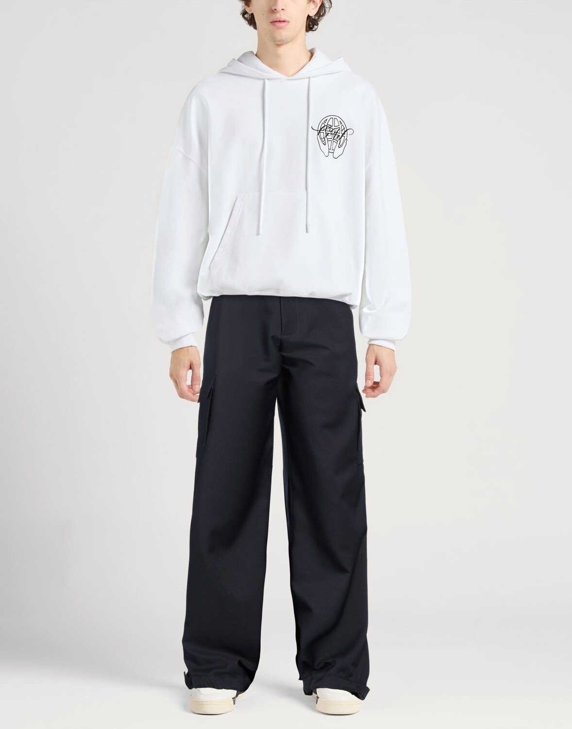 Саржа, логотип бренда, одноцветное изделие, высокая талия, широкая брючина, удобная посадка, застежка-молния, пуговицы, подол на кулиске, множество карманов, карго