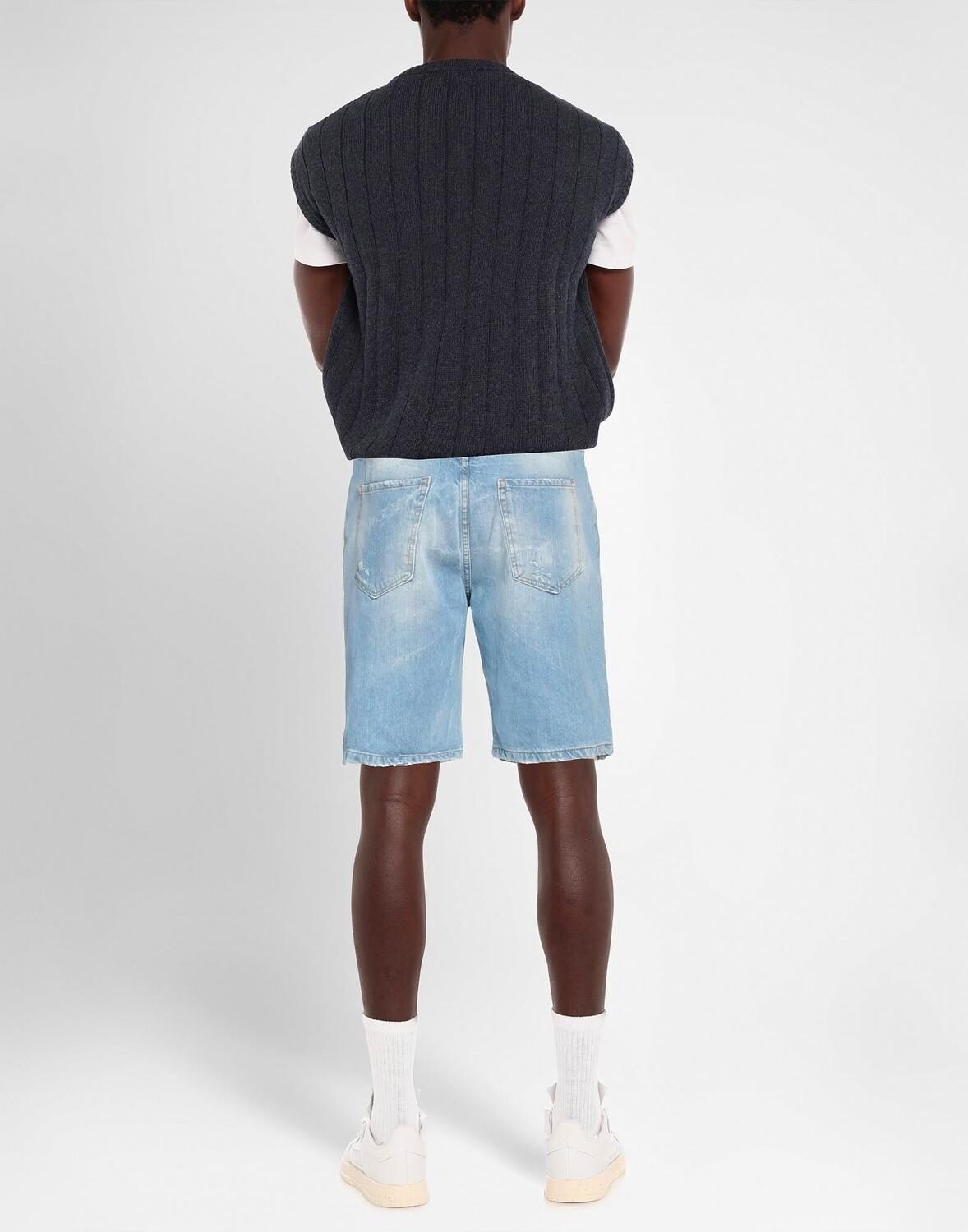 Джинсовая ткань, потертости, выцветший, логотип бренда, одноцветное изделие, светлая потертость, завышенная талия, шлевки для ремня, застежка на пуговицы, множество карманов, шорты
