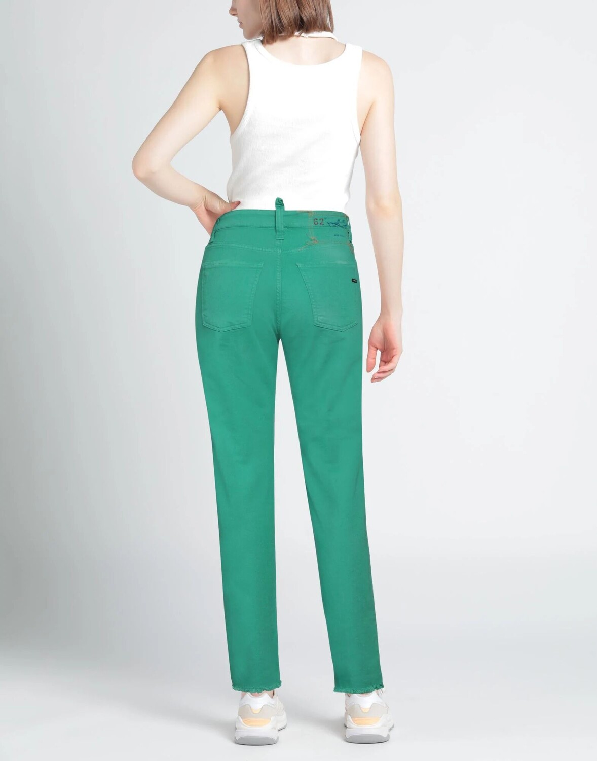 Габардин, потертости, логотип бренда, одноцветное изделие, завышенная талия, стандартный крой, застежка-молния, 1 пуговица, множество карманов, стрейч, машинная стирка, нельзя отбеливать, нельзя сушить в стиральной машине, брюки прямого кроя