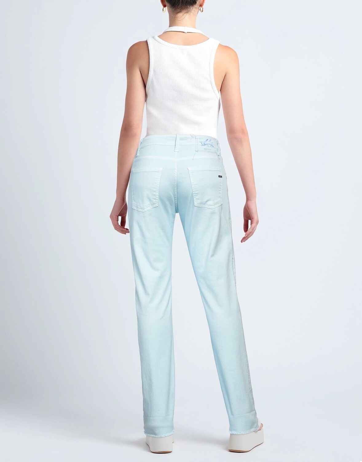 Габардин, потертости, логотип бренда, одноцветное изделие, завышенная талия, стандартный крой, застежка-молния, 1 пуговица, множество карманов, стрейч, машинная стирка, нельзя отбеливать, нельзя сушить в стиральной машине, брюки прямого кроя