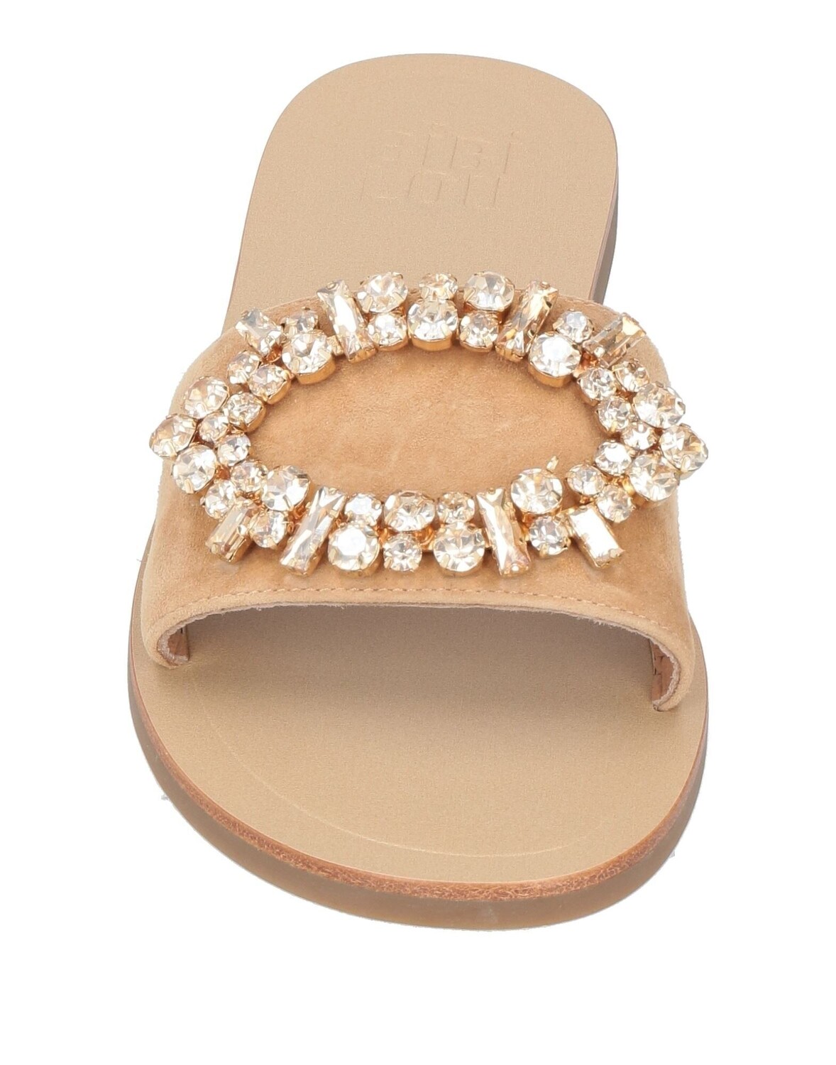 Замша, стразы, металлические аппликации, одноцветное изделие с аппликациями, внутри кожаная подкладка, скругленный носок, плоская подошва с резиновым тиснением, содержит нетекстильные части животного происхождения, шлепанцы