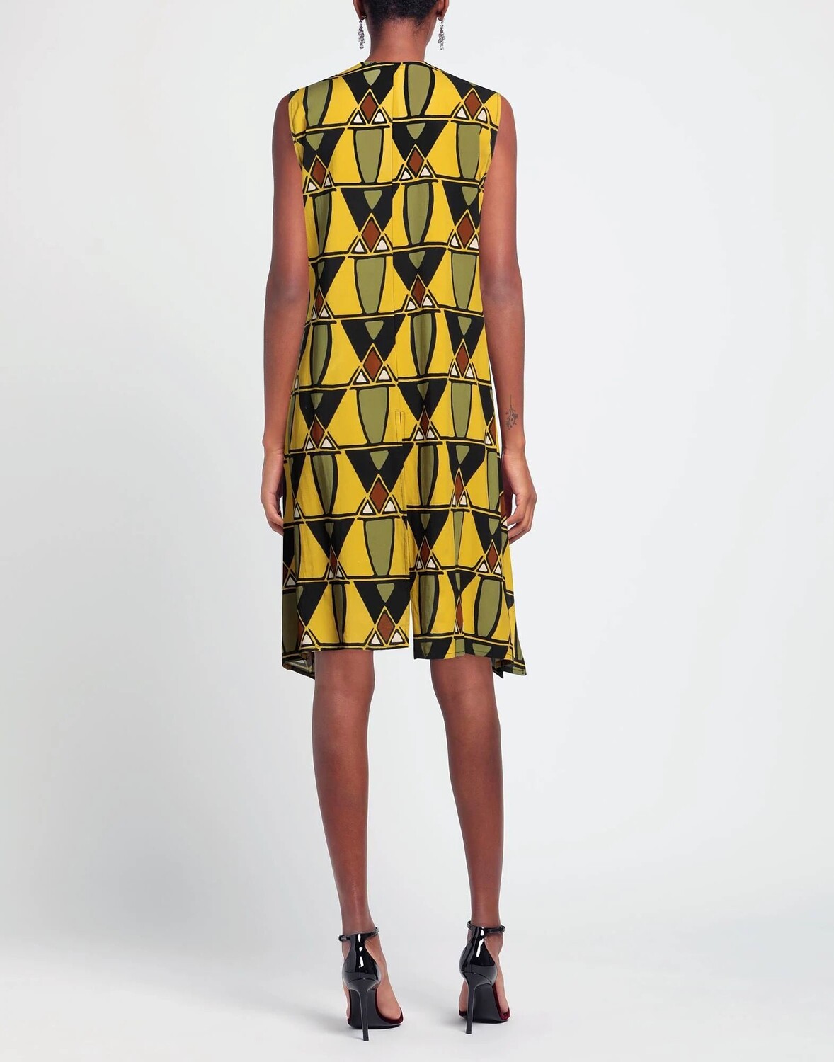 Тканое, без аппликаций, геометрический принт, глубокий вырез, без рукавов, без подкладки, без карманов, расклешенное платье