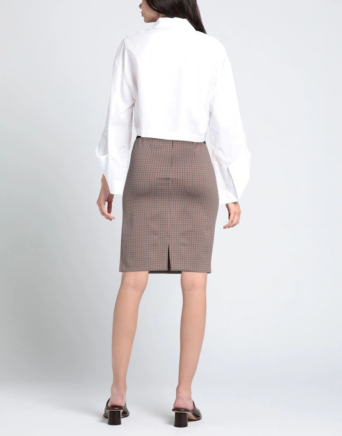 Джерси, контрастные аппликации, узор «гусиные лапки», средняя посадка, резинка на талии, стандартный крой, застежка-молния, без карманов, стрейч, фасон «карандаш», маленький размер