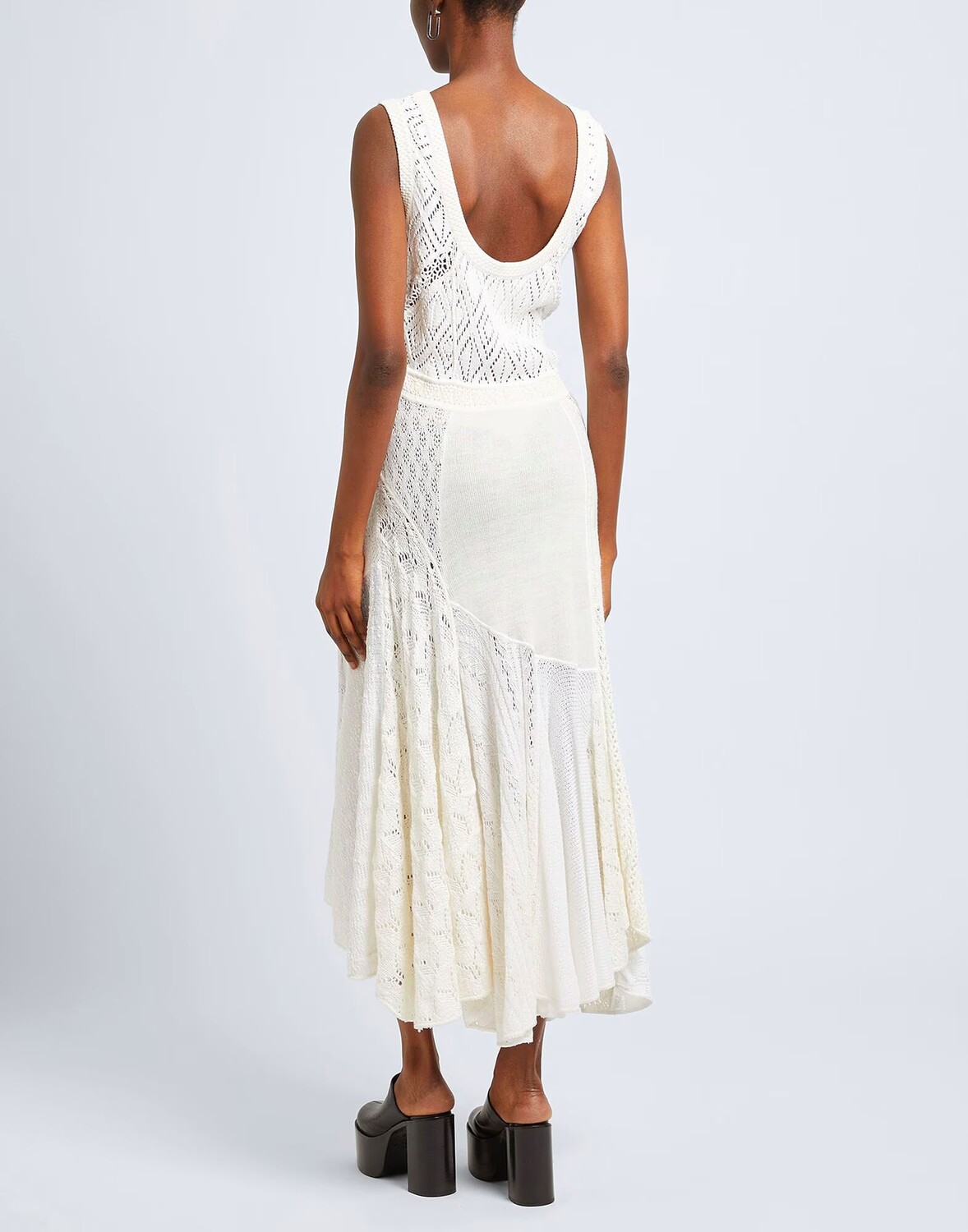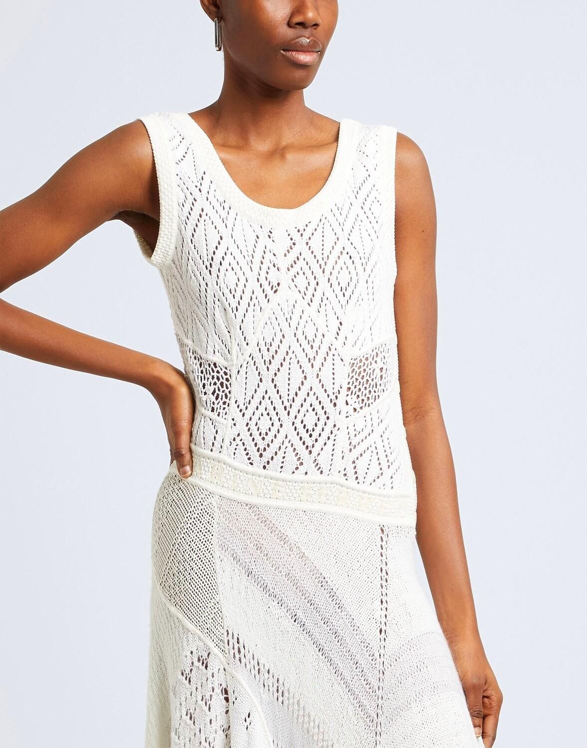 Трикотаж, легкий трикотаж, логотип бренда, одноцветное изделие, овальный вырез, без рукавов, без подкладки, застежка на пуговицы, без карманов, разрез по бокам, химчистка, нельзя сушить в стиральной машине, не отбеливать, асимметричное платье