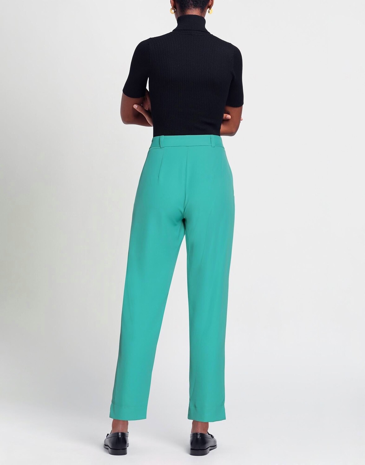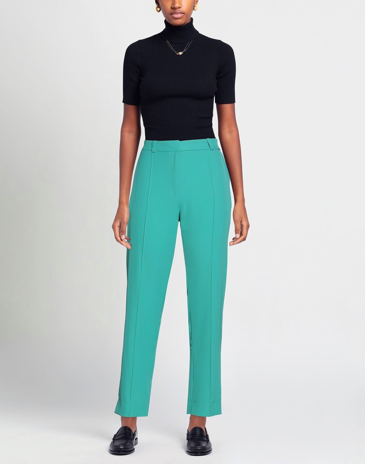 Креп, логотип бренда, одноцветное изделие, завышенная талия, прямые брючины, стандартный крой, застежка на крючки, застежка-молния, множество карманов, стрейч