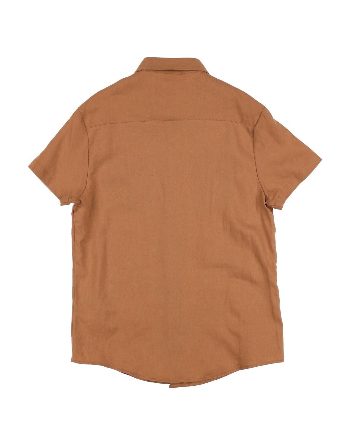 Полотняное переплетение, логотип бренда, одноцветное изделие, классический воротник, короткие рукава, пуговицы, два нагрудных кармана, стирка при 30°C, химическая чистка, нельзя отбеливать, нельзя сушить в стиральной машине, гладить при температуре не выше 110°C