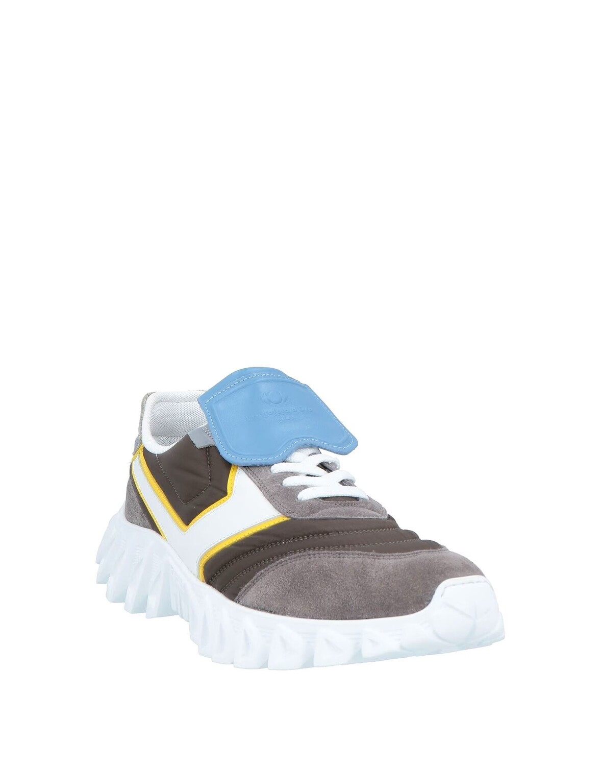 Кожа, техническая ткань, эффект замши, логотип бренда, разноцветный рисунок, кожаная подкладка, шнуровка, скругленный носок, танкетка, резиновая подошва с тиснением, содержит нетекстильные части животного происхождения, низкие кеды и кроссовки