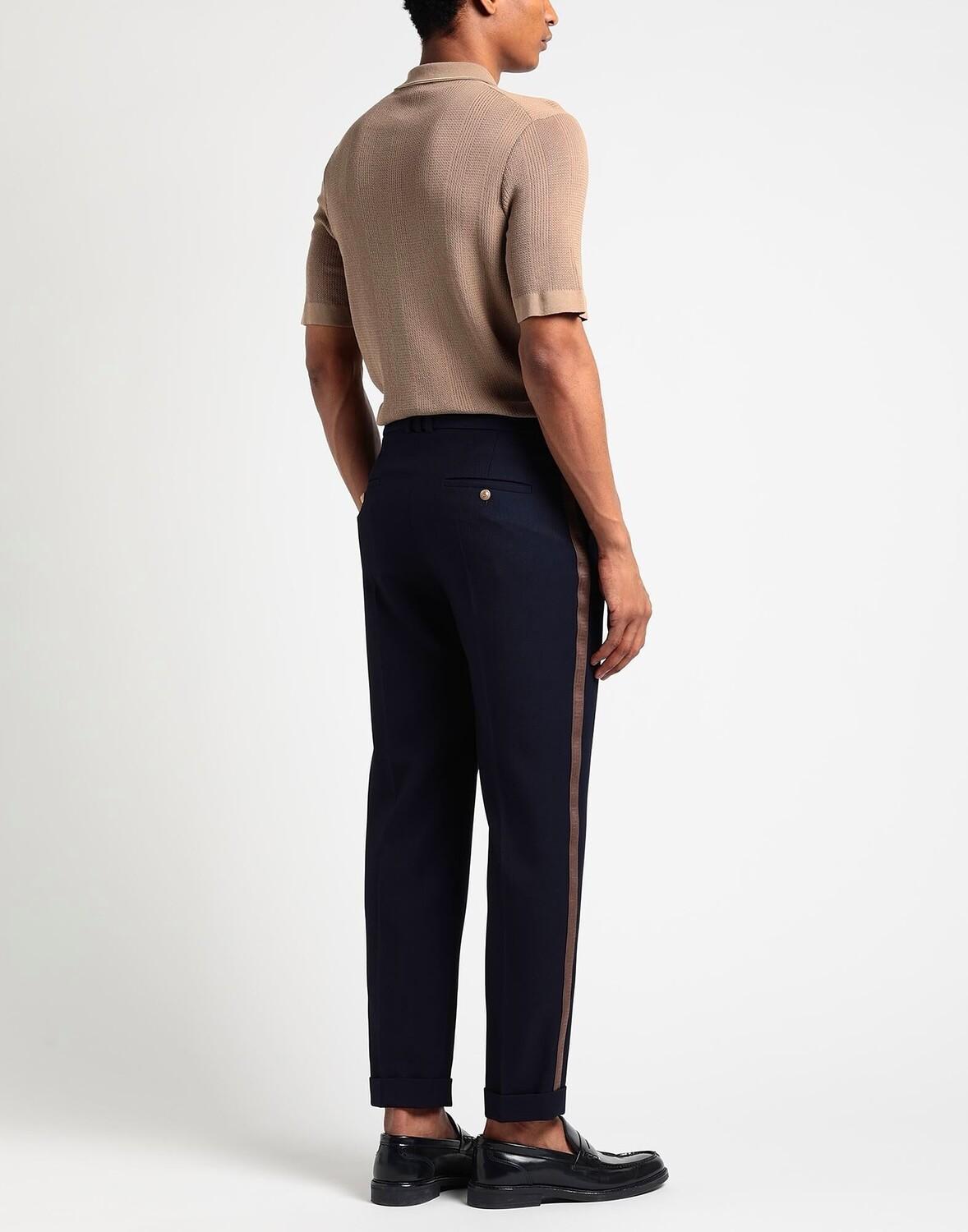 Саржа, полоски по боковым швам, одноцветное изделие с аппликациями, средняя посадка, зауженные брючины, классический крой, застежка-молния, подвернутый низ, множество карманов, химчистка, нельзя отбеливать, нельзя сушить в стиральной машине, брюки строгого кроя