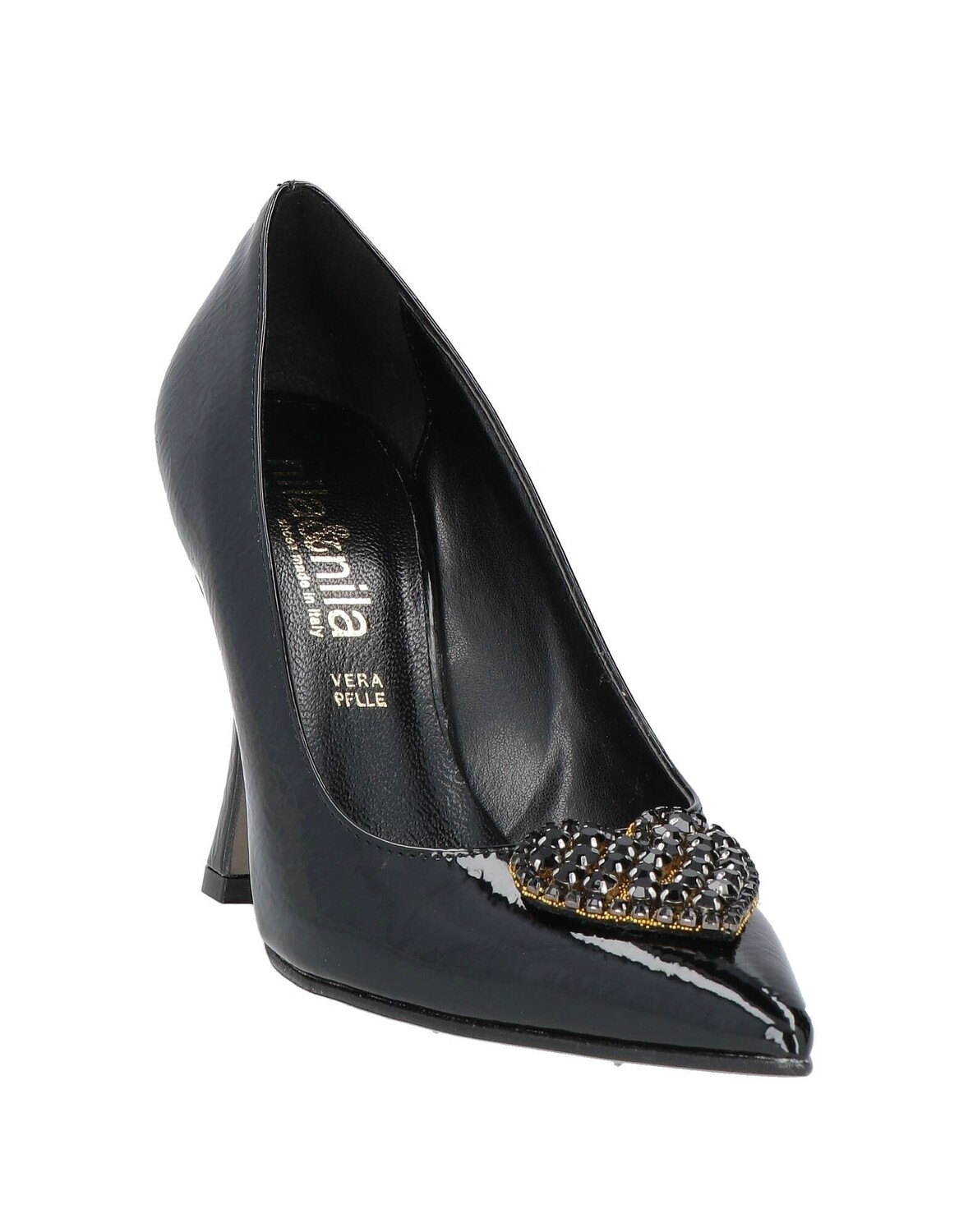 Ткань с покрытием, эффект лака, стразы, одноцветное изделие с аппликациями, внутри на подкладке, узкий носок, катушечный каблук, обтянутый каблук, кожаная подошва, содержит нетекстильные части животного происхождения, туфли-лодочки