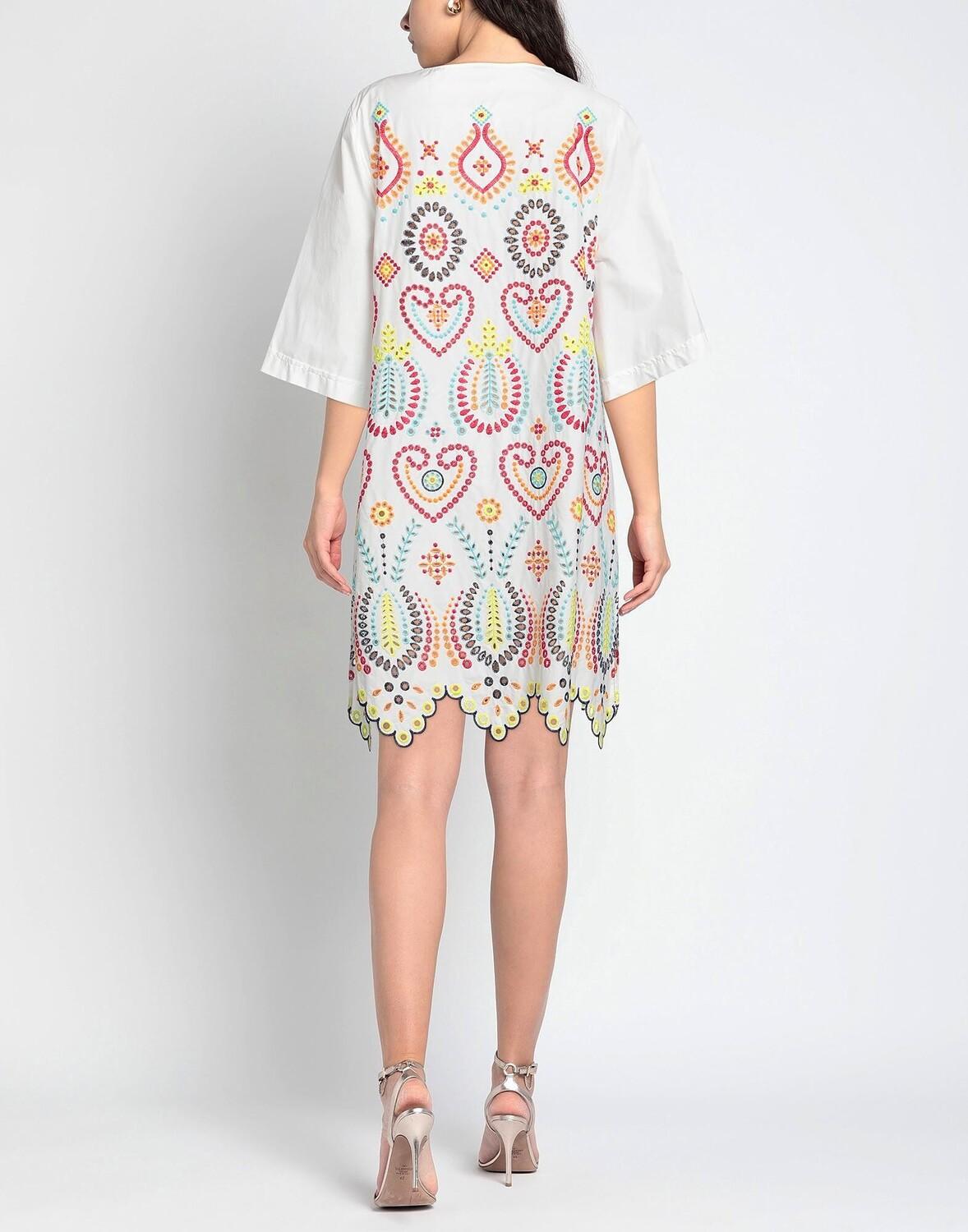 Полотняное переплетение, вышивка, разноцветный узор, вырез галстук-бабочка, рукава 3/4, без подкладки, без карманов, фасон трапеция