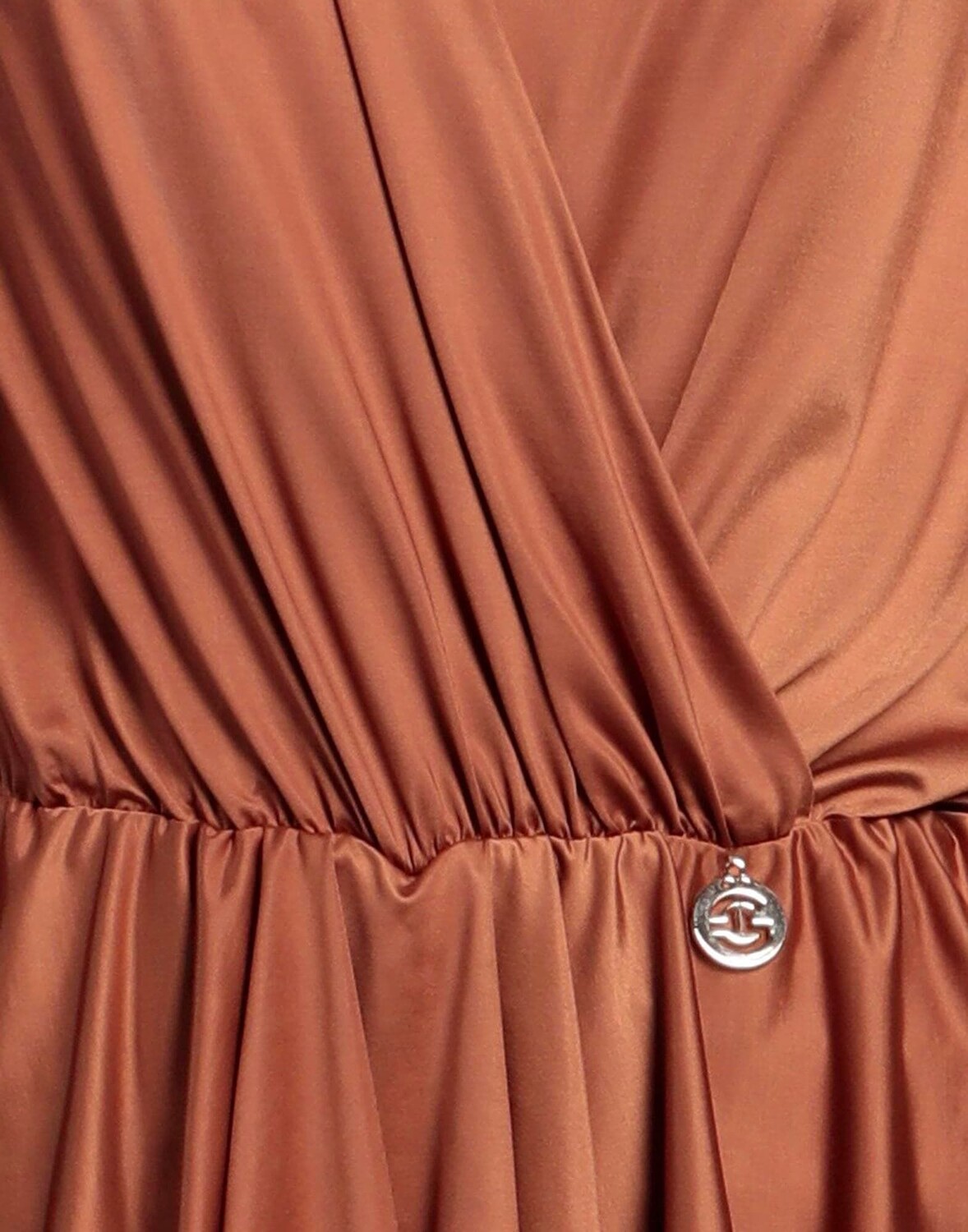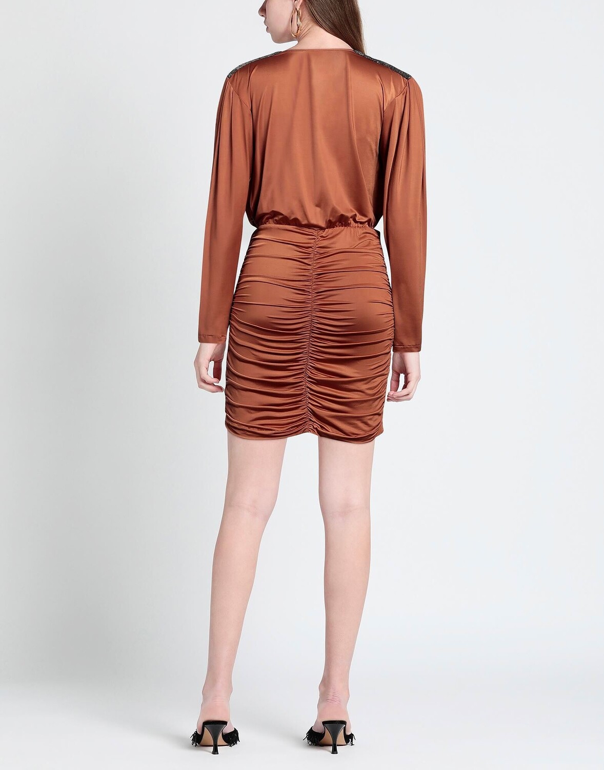 Синтетический трикотаж, логотип бренда, присборки, одноцветное изделие, драпированный вырез горловины, длинные рукава, без подкладки, без карманов, стрейч, облегающее платье