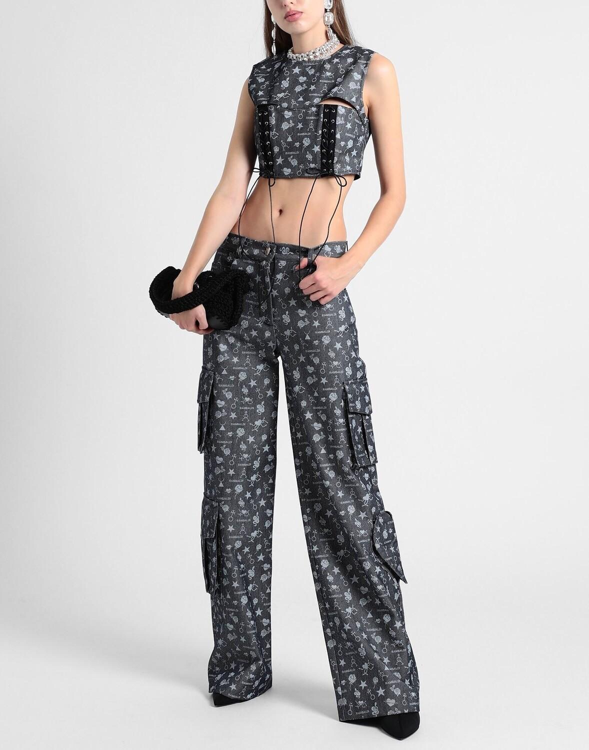 Деним, логотип бренда, двухцветный вариант, принт с логотипом, темная стирка, завышенная талия, прямые брючины, стандартный крой, 1 пуговица, застежка-молния, множество карманов, карго