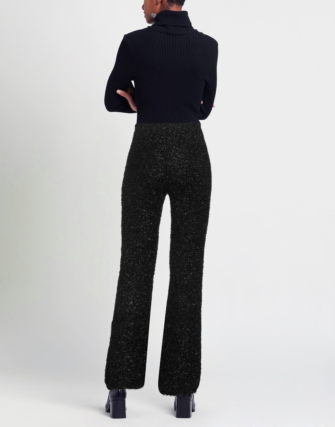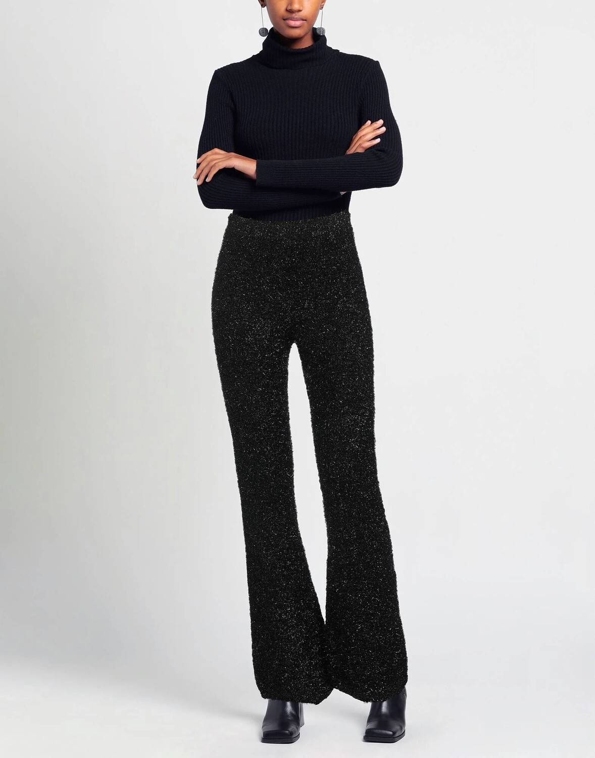 Трикотаж, легкая вязка, без аппликаций, одноцветное изделие, завышенная талия, приталенный крой, без карманов, ручная стирка или химчистка, нельзя отбеливать, нельзя сушить в стиральной машине, брюки-клеш