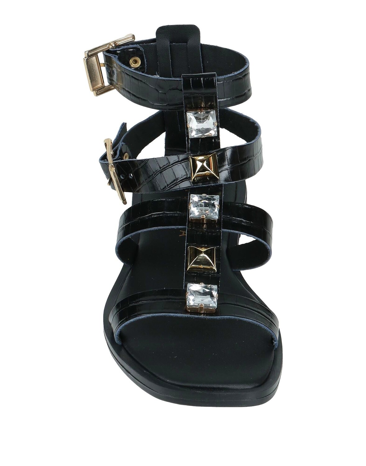 Кожа, крокодиловый принт, металлические аппликации, стразы, однотонный цвет с аппликациями, подкладка из кожи, ремешок с пряжкой, квадратный носок, без каблука, резиновая подошва, содержит нетекстильные части животного происхождения, сандалии-гладиаторы