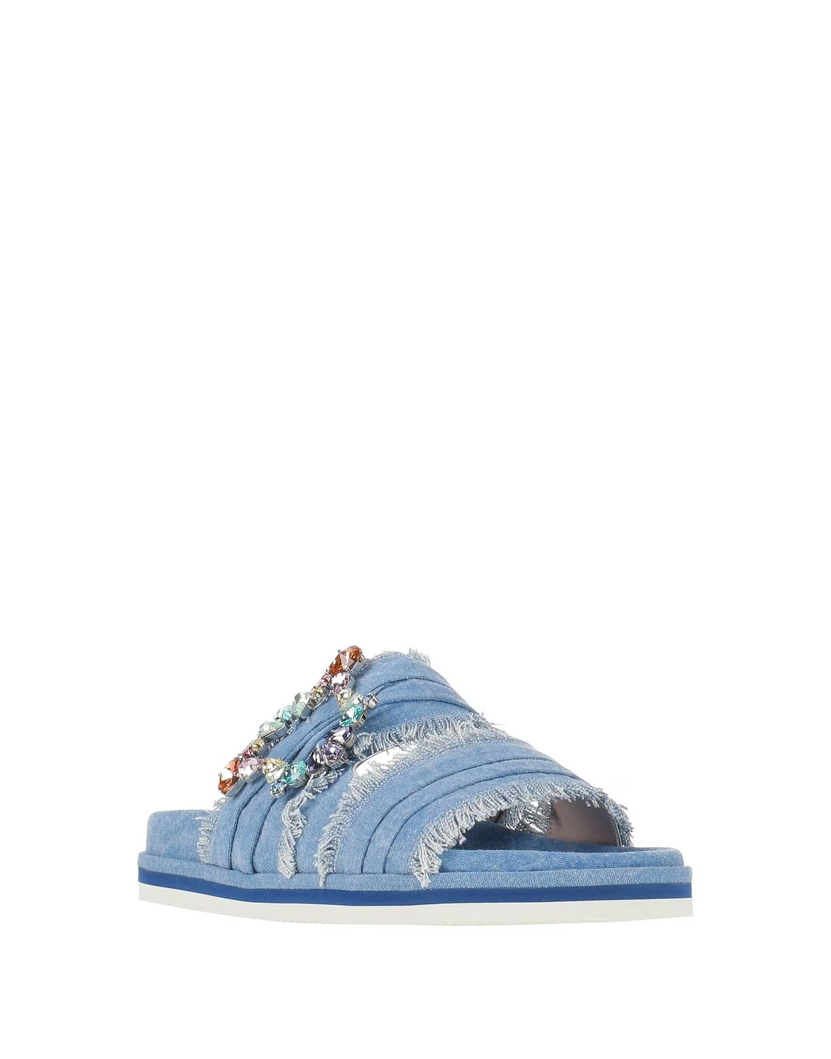 Джинсовая ткань, стразы, одноцветное изделие с аппликациями, подкладка из кожи, скругленный носок, плоская подошва с резиновым тиснением, содержит нетекстильные части животного происхождения, сандалии