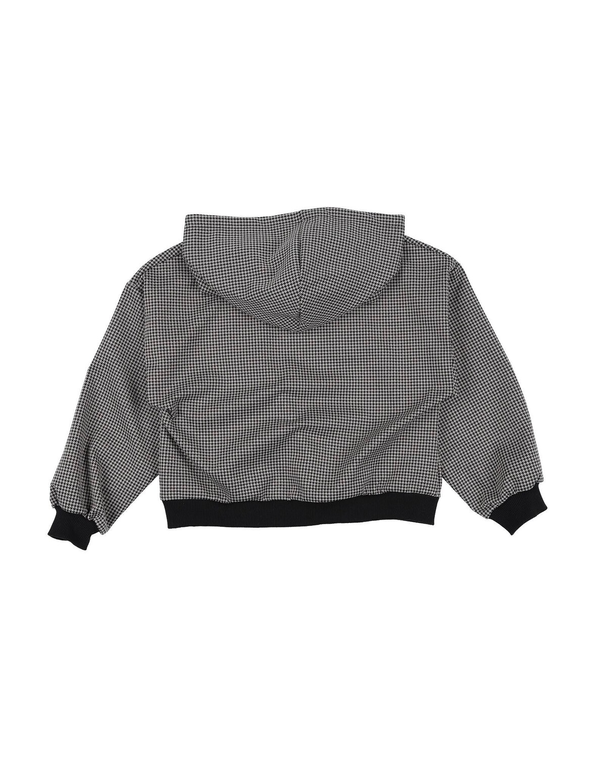 Джерси, ламе, принт, металлизированный принт, узор «гусиные лапки», воротник с капюшоном, длинные рукава, без карманов, стрейч, стирка при 30°C, химическая чистка, нельзя отбеливать, можно сушить в стиральной машине, гладить при температуре не выше 110°C