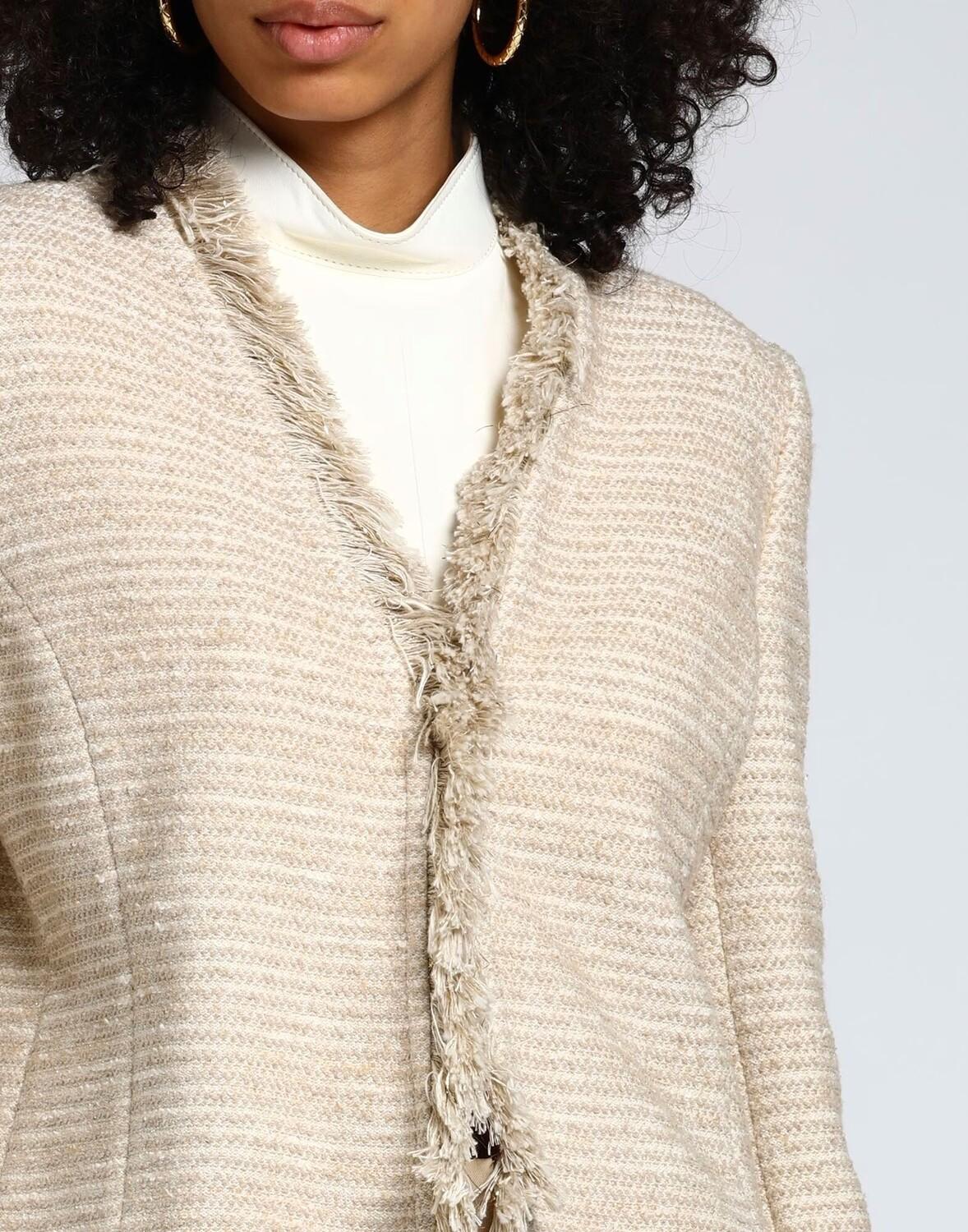 Трикотаж, букле, ламе, средней плотности, бахрома, двухцветный, V-образный вырез, однобортный, длинные рукава, на подкладке, застежка на крючки, без карманов, однобортный жакет