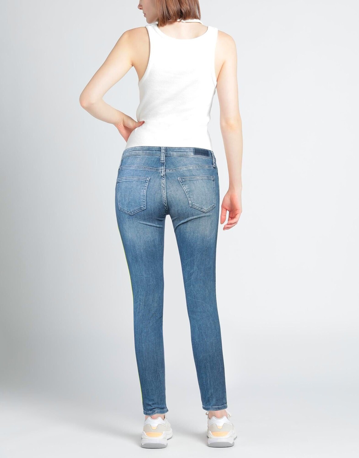 Джинсовая ткань, контрастные аппликации, логотип бренда, одноцветное изделие, средняя степень стирки, заниженная талия, шлевки для ремня, зауженные брючины, узкие брюки, 1 пуговица, застежка-молния, пять карманов, стрейч, модель скинни