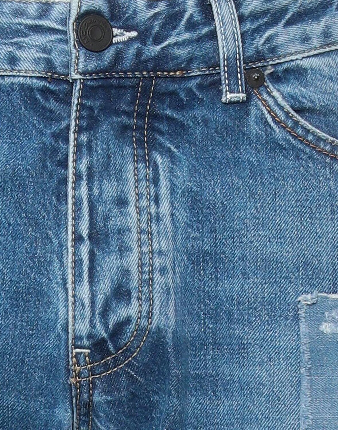 Деним, выцветший, эффект потертости, логотип бренда, одноцветное изделие, средняя потертость, шароварный крой, шлевки для ремня, прямые брючины, стандартный крой, пуговицы, пять карманов, модель прямого кроя