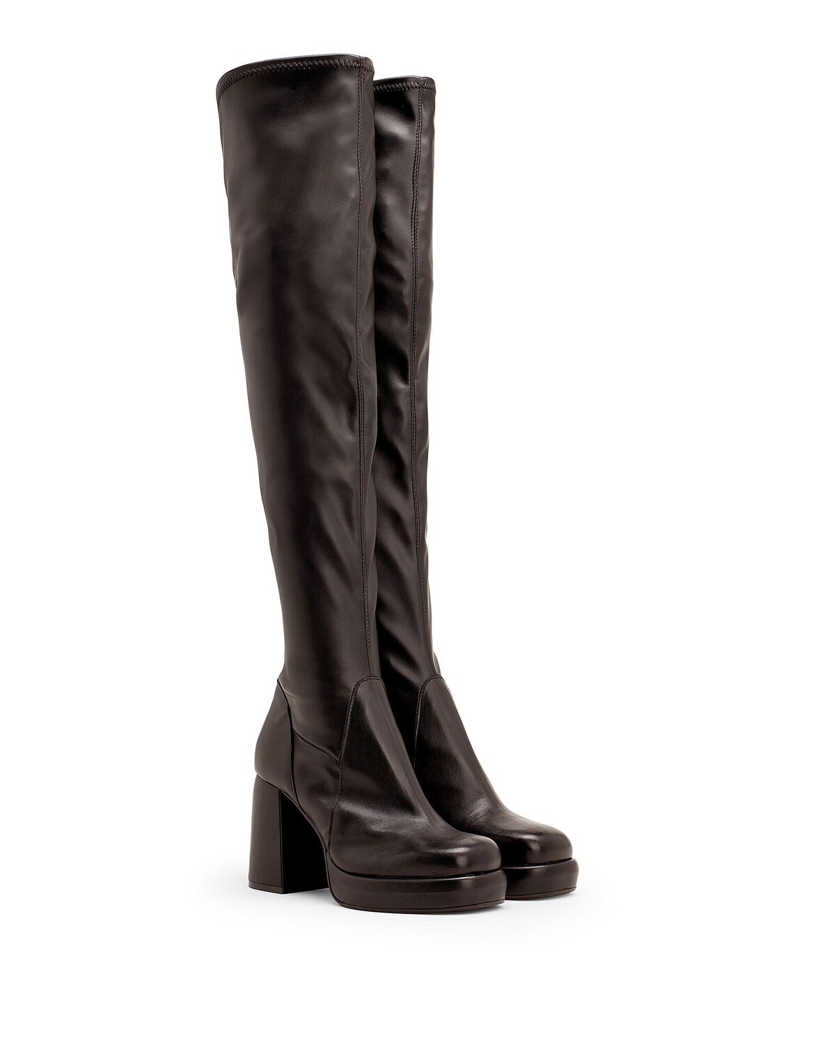 Ткань с покрытием, без аппликаций, одноцветное изделие, кожаная подкладка, застежка-молния, квадратный носок, квадратный каблук, обтянутый каблук, резиновая подошва, содержит нетекстильные части животного происхождения, модель ботфортов