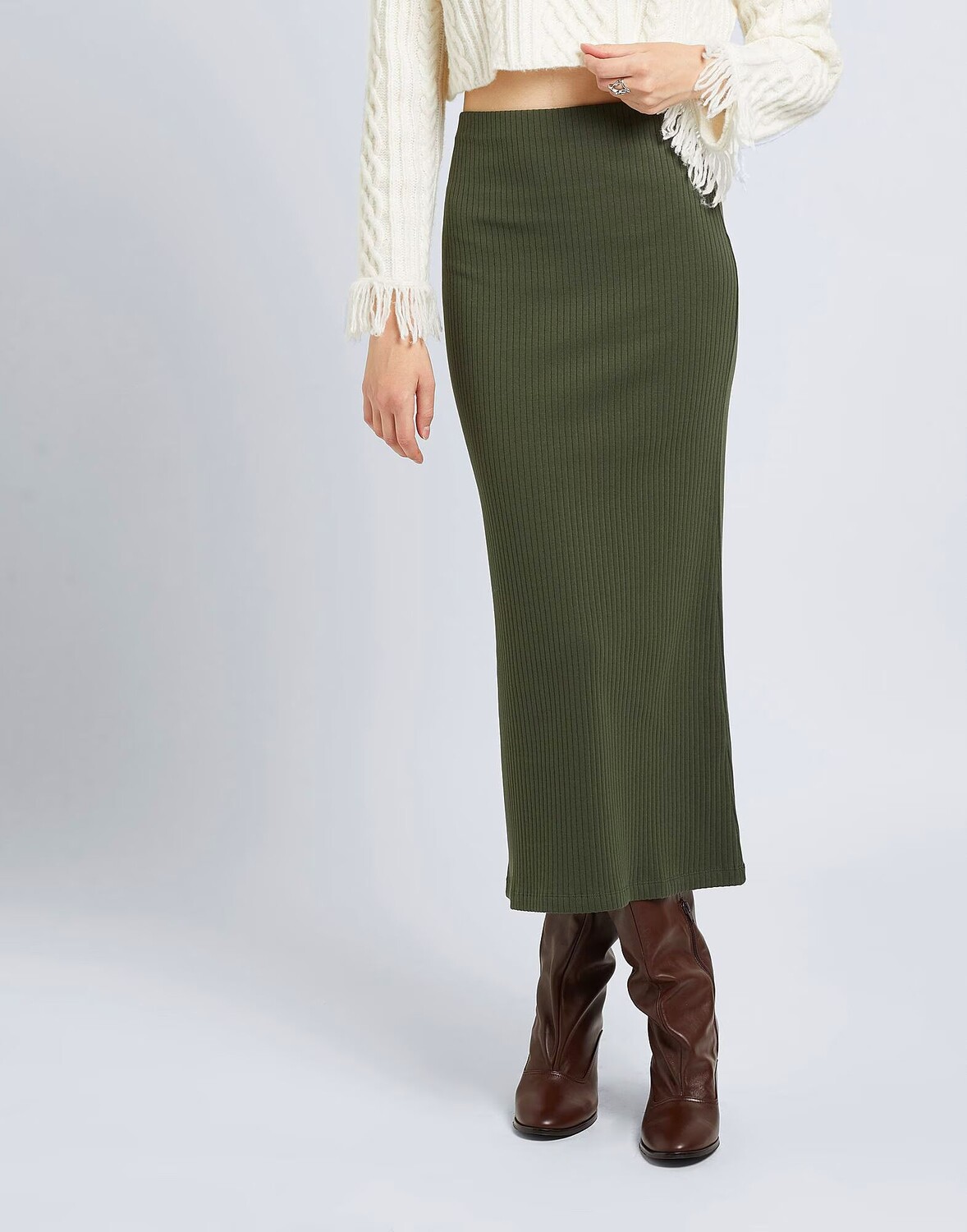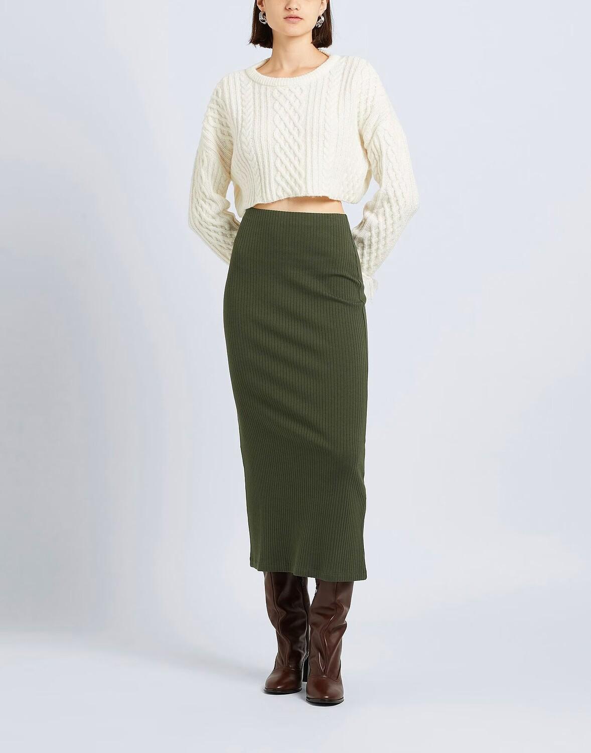 Юбка-макси изготовлена ​​из мягкого трикотажа с ребристой текстурой. Он сидит высоко на талии и имеет эластичный пояс для удобной посадки. Расклешенная юбка идеально подходит для женственного образа: ее можно сочетать с футболкой для повседневного выхода или с блузкой для более формального образа.